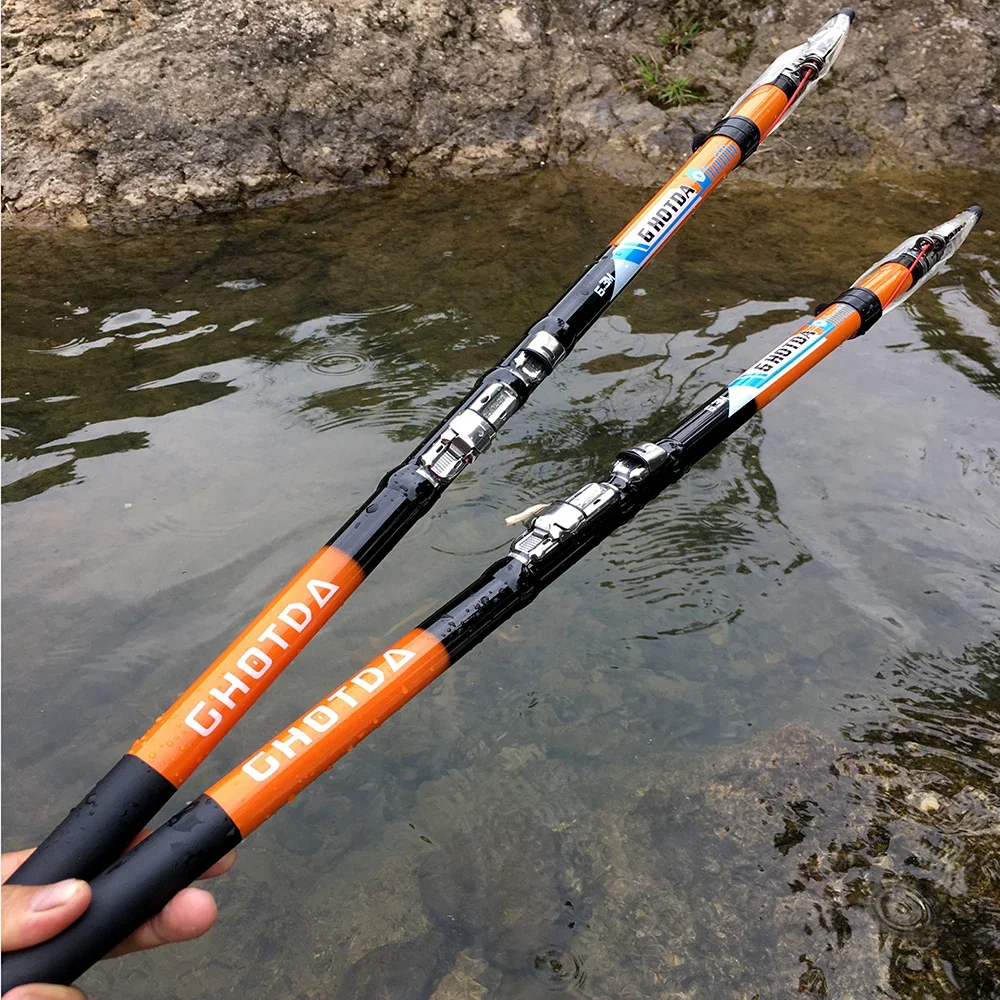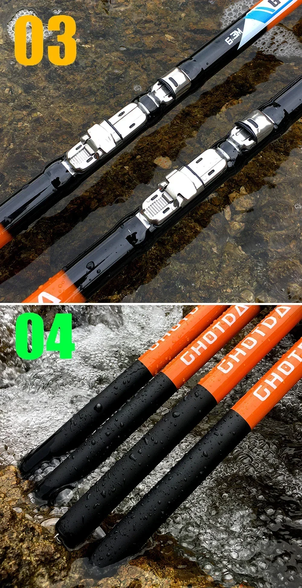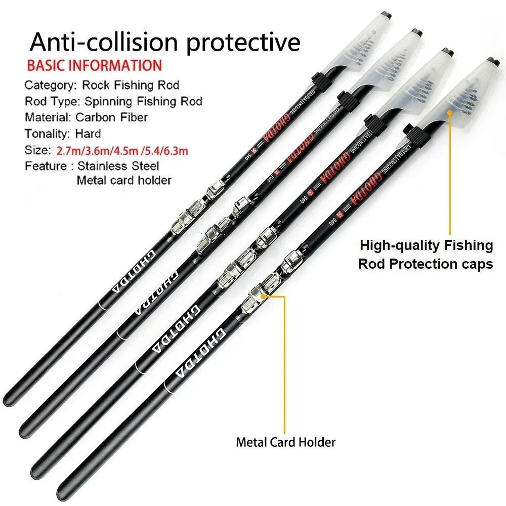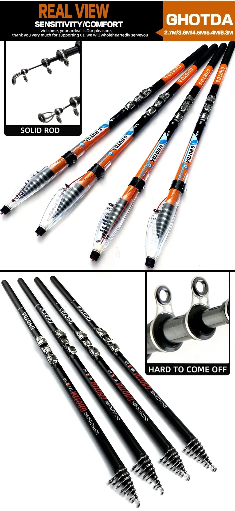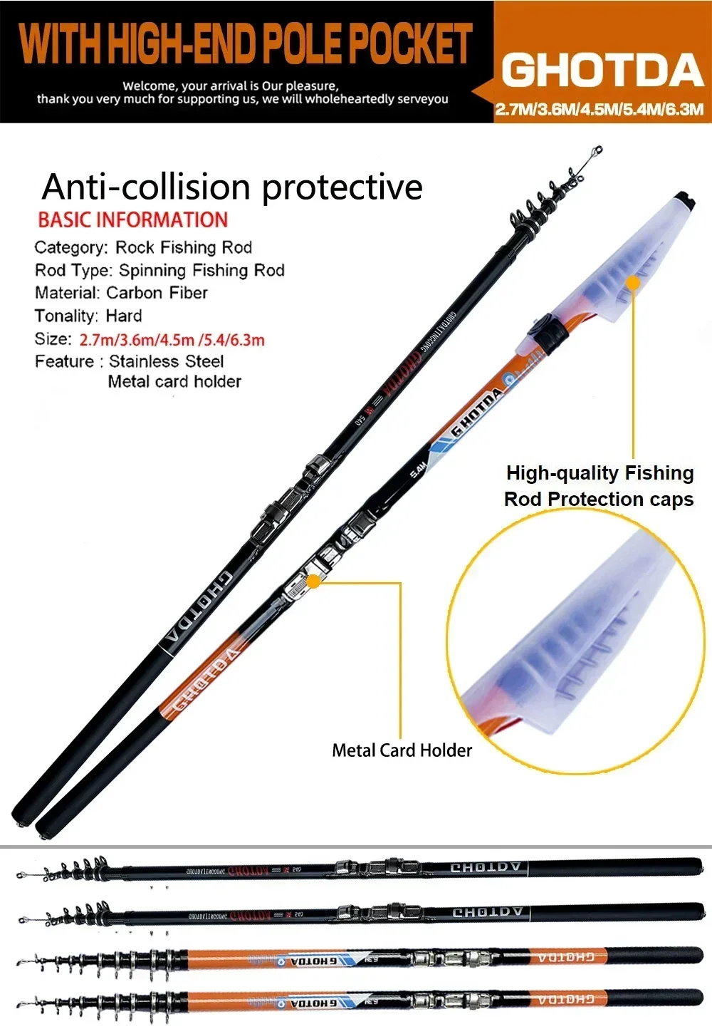 1.Con su diseño giratorio telescópico, esta caña de pescar viene en una variedad de tamaños: 2,7 M, 3,6 M, 4,5 M, 5,4 M y 6,3 M, lo que la hace ideal para usar en diversos escenarios, incluidos estanques de embalse, océanos y pesca en roca..