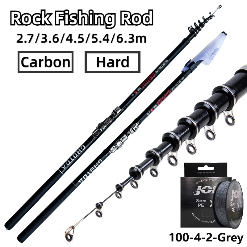1.Con su diseño giratorio telescópico, esta caña de pescar viene en una variedad de tamaños: 2,7 M, 3,6 M, 4,5 M, 5,4 M y 6,3 M, lo que la hace ideal para usar en diversos escenarios, incluidos estanques de embalse, océanos y pesca en roca..