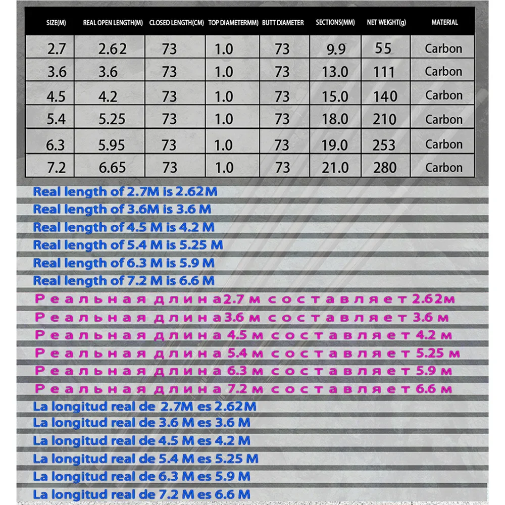 Tenga en cuenta: El M 3,6, 4,5 M, 5,4 M, 6,3 M, 7,2 M es solo un modelo, no es la longitud real. La longitud real de cualquier varilla telescópica es un poco más corta o más larga que la longitud del modelo. Esperamos su comprensión. ¡Gracias!
