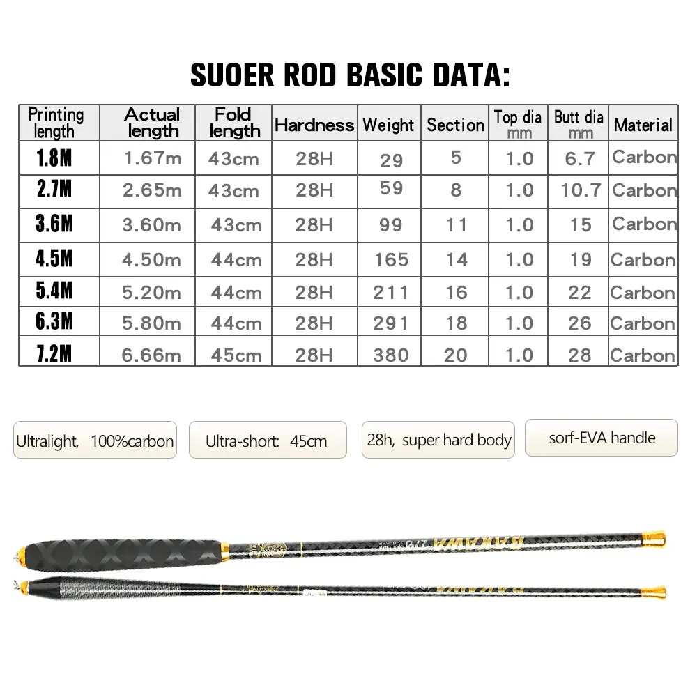 Caña de pescar telescópica de carbono de alta calidad, 1,8 m pequeña de caña de pescar, 3,6 m, 4,5 m, 5,4 m, 6,3 m, 7,2 m