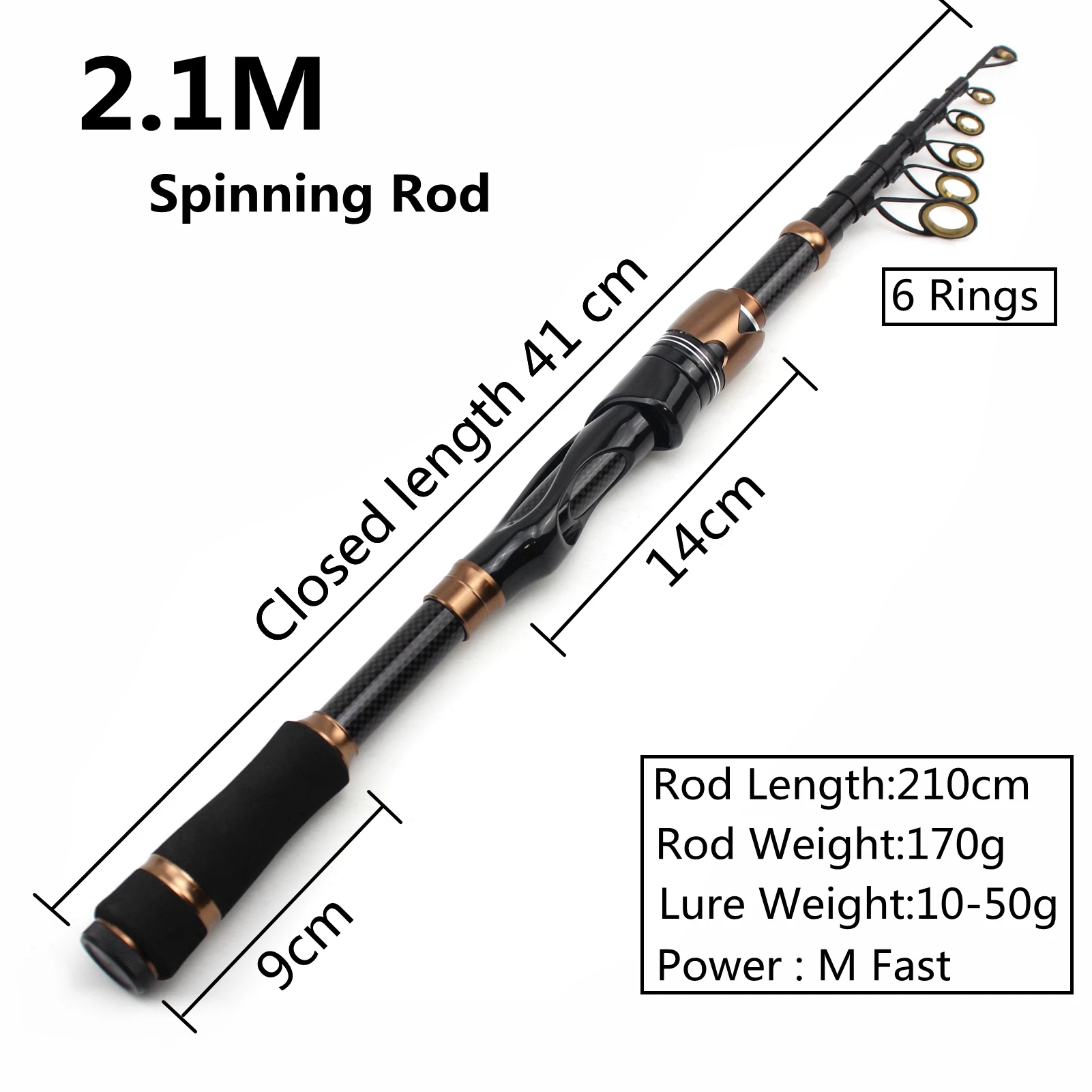 2,1 M Varilla + 3000 Carrete ---- Longitud: 210cm | Longitud cerrada: 41cm | Parte: 8 | Peso de la varilla: 170g | Diámetro del mango: 25mm | Diámetro superior: 1,7mm | Peso del cebo: 10-50g