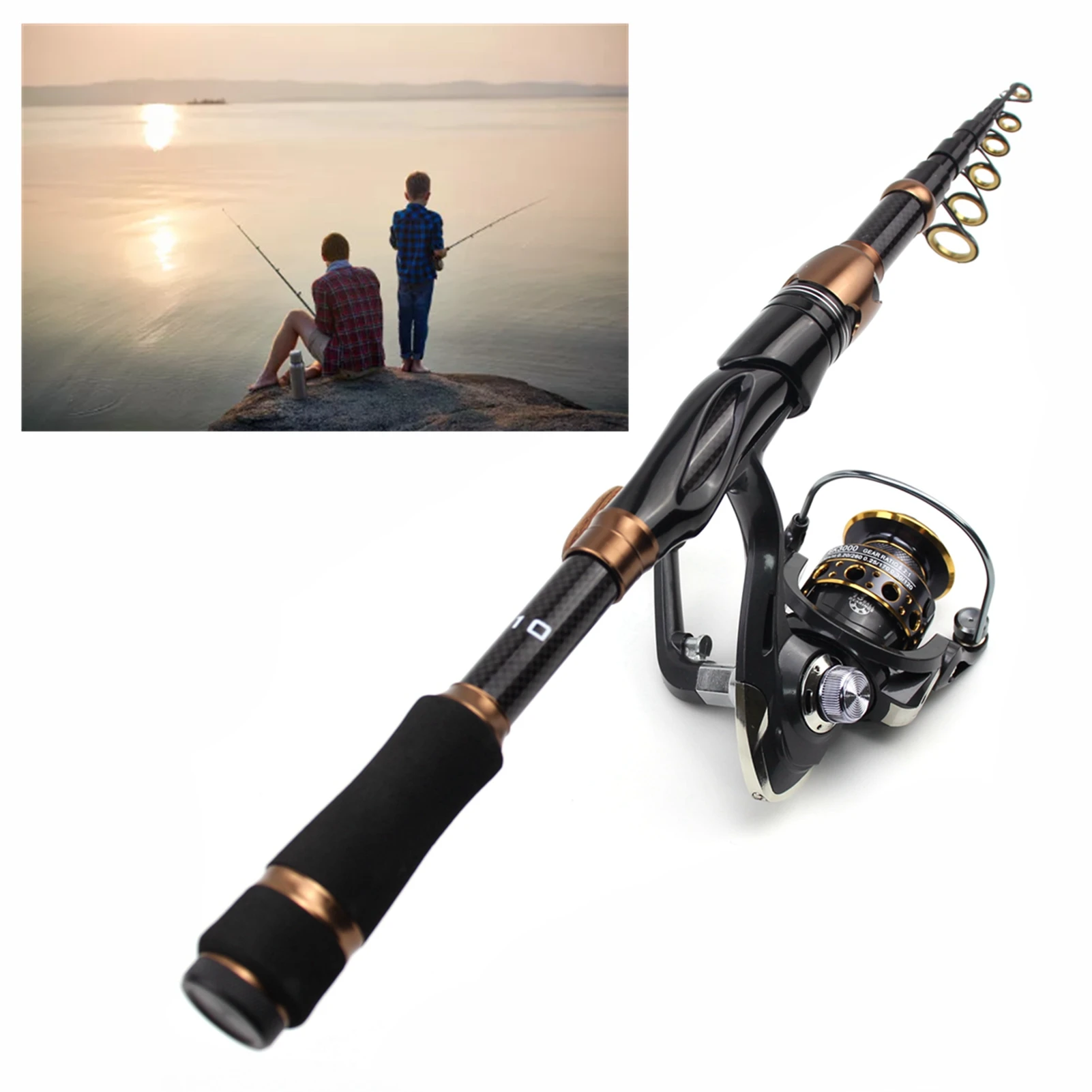 1. Juego de caña de pescar y carrete de cebo telescópico giratorio, el tamaño se reduce en 41 cm. Es conveniente llevarlo en una maleta, y puede pasar un rato agradable con su familia los fines de semana o al aire libre pescando. Tamaño del poste telescópico: 2,1 M.