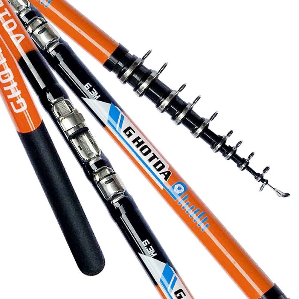 1. Con su diseño giratorio telescópico, esta caña de pescar viene en una gama de tamaños-2,7 M, 3,6 M, 4,5 M, 5,4 M, y 6,3 M, lo que lo hace ideal para su uso en diversos escenarios, incluidos estanques de depósito, océanos y pesca en roca.