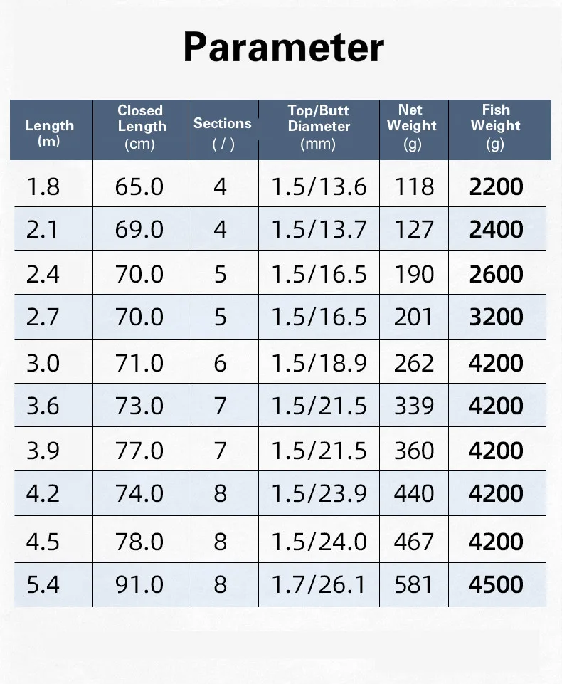 Longitud: 1,8-5,4 m Longitud cerrada: 65-91 cm