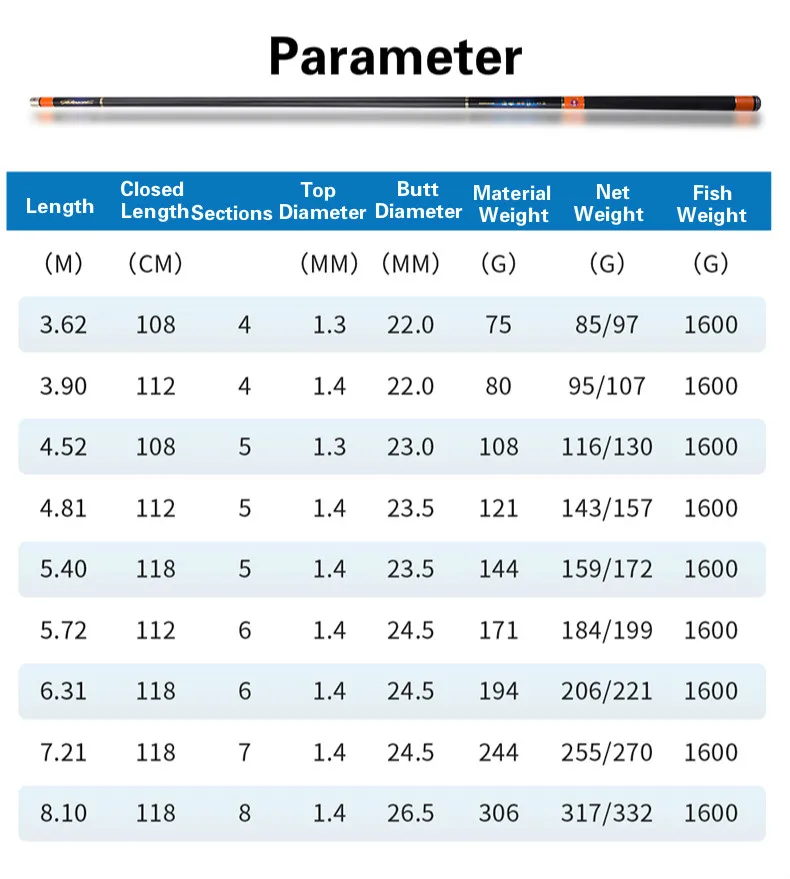 Longitud: 3,6-8,1 m Longitud cerrada: 108-118 cm