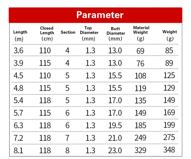 Longitud: 3,6-8,1 m Longitud cerrada: 110-118 cm