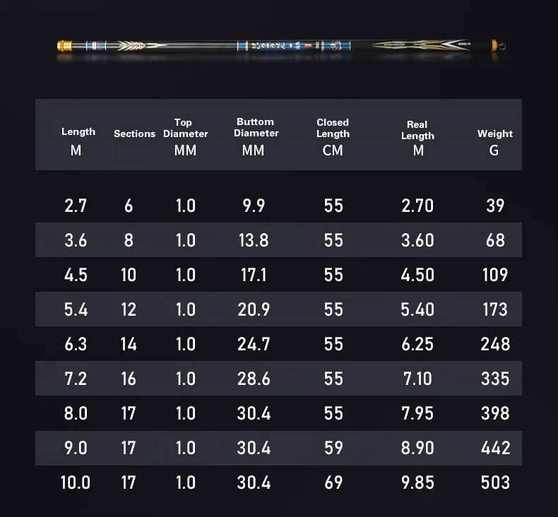 Longitud: 2,7-10,0 M Longitud cerrada: 55-69cm