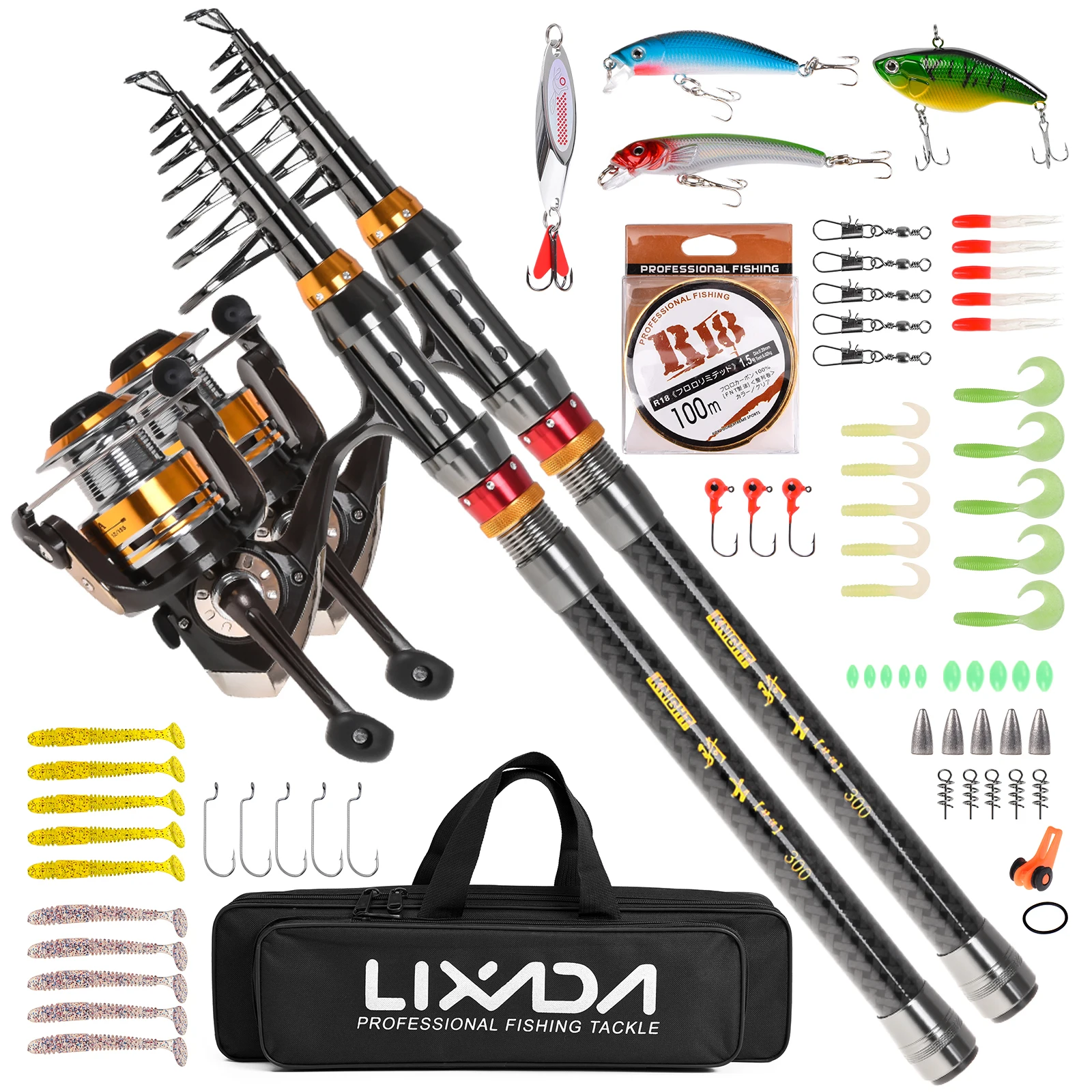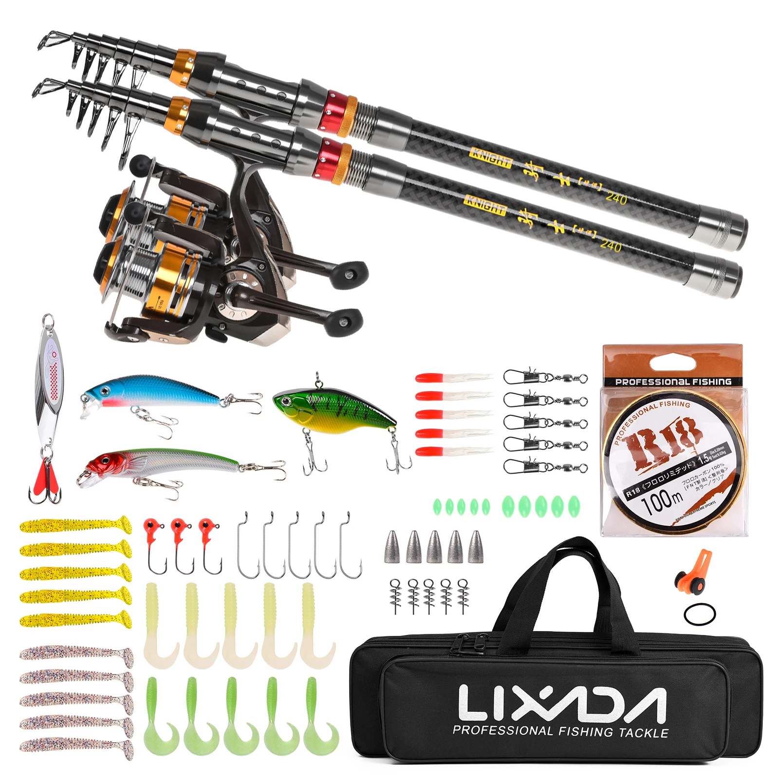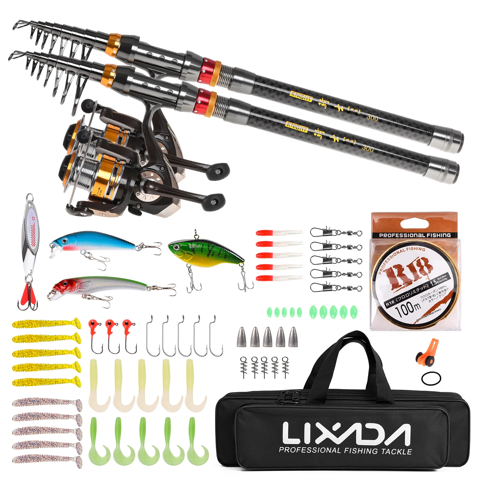 Este conjunto completo de pesca incluye 2 cañas de pescar, 2 carretes giratorios, Sedal, señuelos, anzuelos, eslabones giratorios y algunos otros accesorios necesarios en la pesca. Con una bolsa de transporte, este combo de pesca es conveniente para almacenar y transportar, gran regalo tanto para principiantes como para pescadores profesionales.