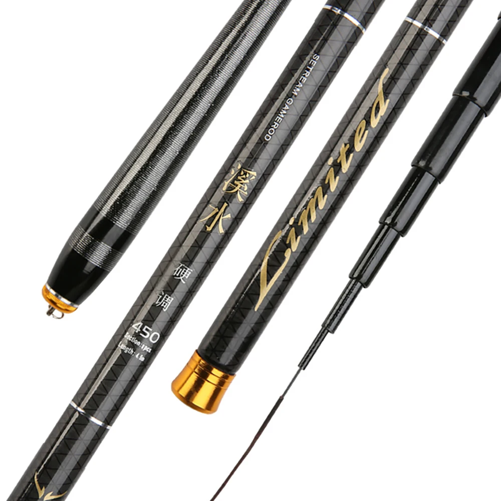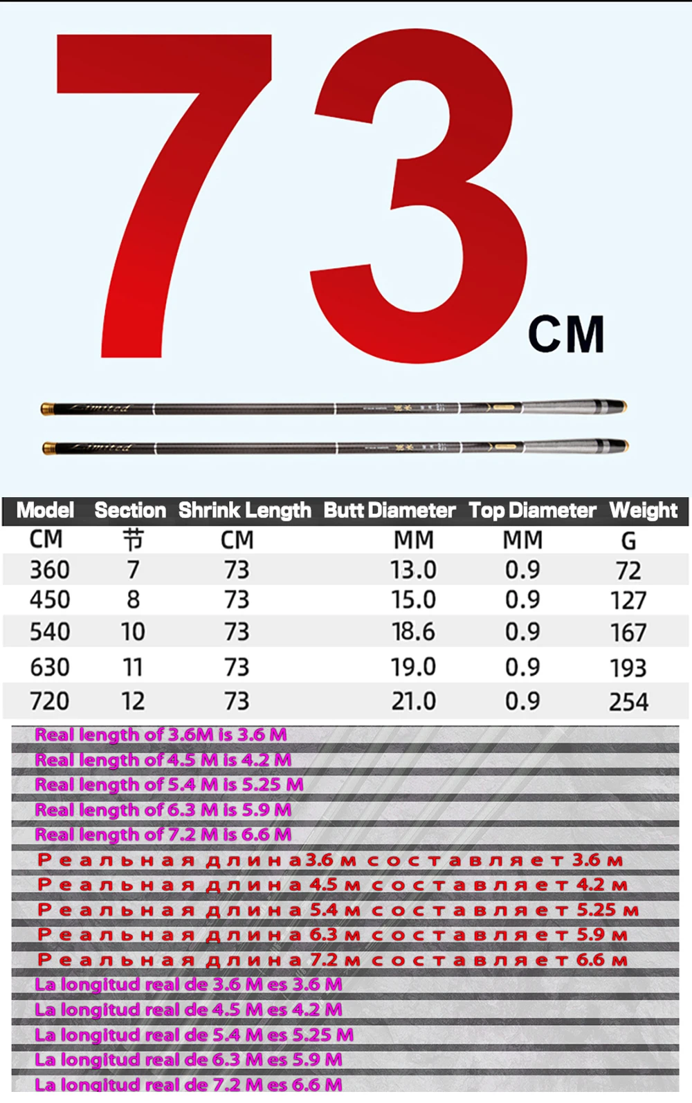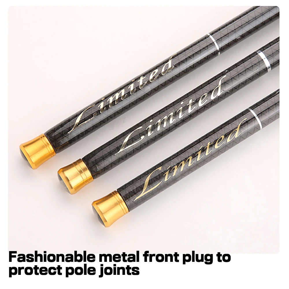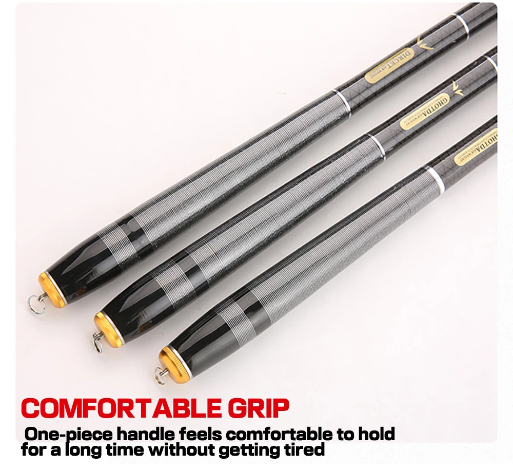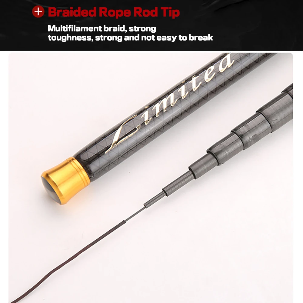 Material: fibra de carbonoTamaño: 3,6 M/4,5 M/5,4 M/6,3 M/7,2 MPeso de la varilla: 72-254GPeso de la línea: alrededor de 1,5-2,0 kgDiámetro superior: 0,9mm