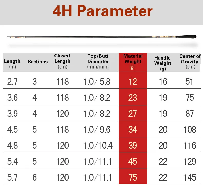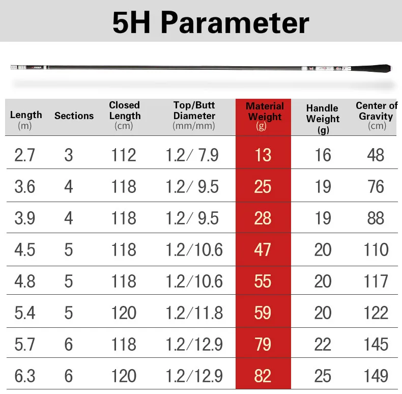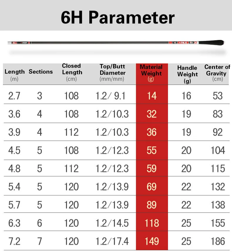 Longitud: 2,7-7,2 m Longitud cerrada: 108-120cmMaterial: carbonoDureza: Super duro