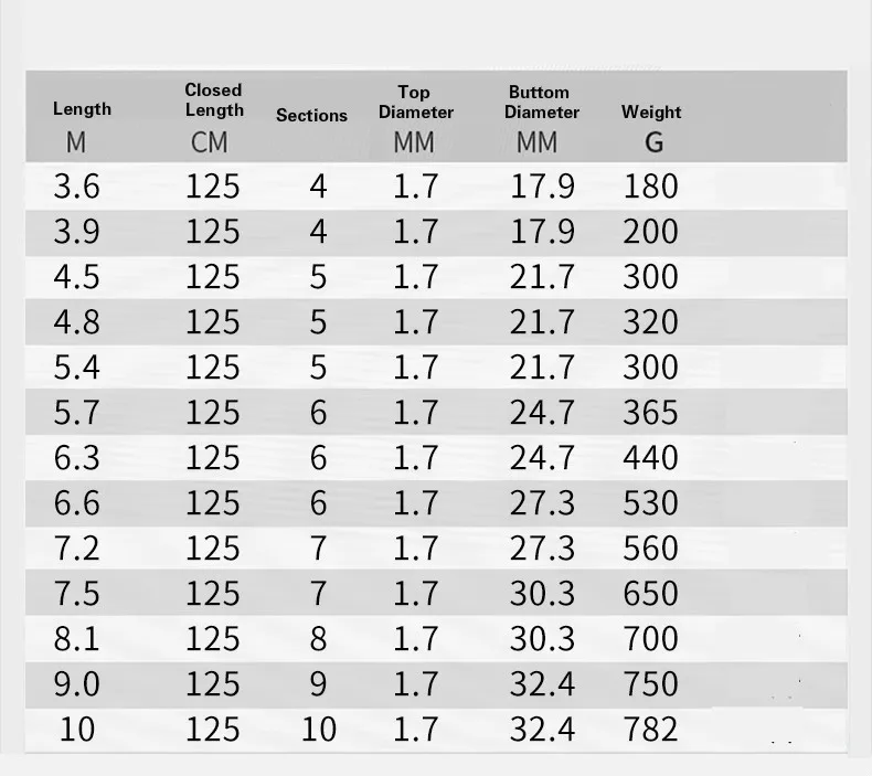 Longitud: 3,6-10 m Longitud cerrada: 125 cm