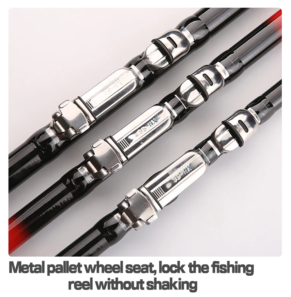 La varilla está diseñada con un revestimiento de pintura al horno de piano duradero y elegante, con un acabado completo y brillante que es resistente a la decoloración. El asiento de hebilla de tarjeta de metal garantiza que su carrete de pesca esté firmemente bloqueado en su lugar y no se tambalee. Además, tiene un agarre cómodo y ergonómico, lo que hace que sea fácil de sostener durante períodos prolongados.