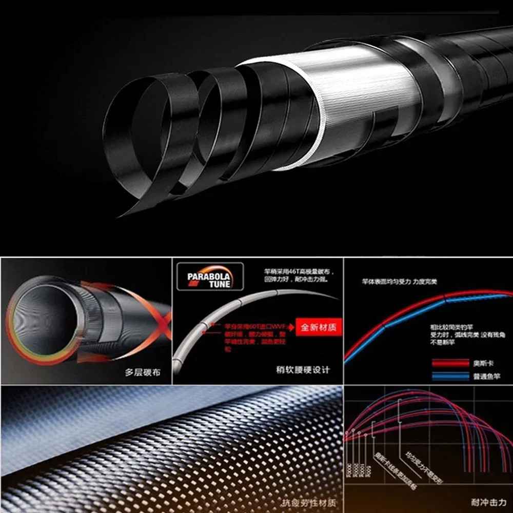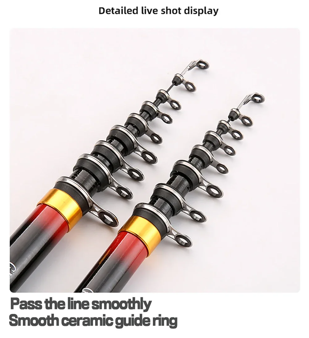 Caña de pescar telescópica ligera y duradera 2,7 M/3,6 M/4,5 M/5,4 M/6,3 M para todos los carretes de pesca Estanque de depósitoPresentamos nuestra caña de pescar en roca de alta calidad hecha con fibra de carbono de primera calidad, ¡perfecta para todas sus aventuras de pesca! Con su diseño giratorio telescópico, esta caña de pescar viene en una gama de tamaños-2,7 M, 3,6 M, 4,5 M, 5,4 M, y 6,3 M, lo que lo hace ideal para su uso en diversos escenarios, incluidos estanques de depósito, océanos y pesca en roca.