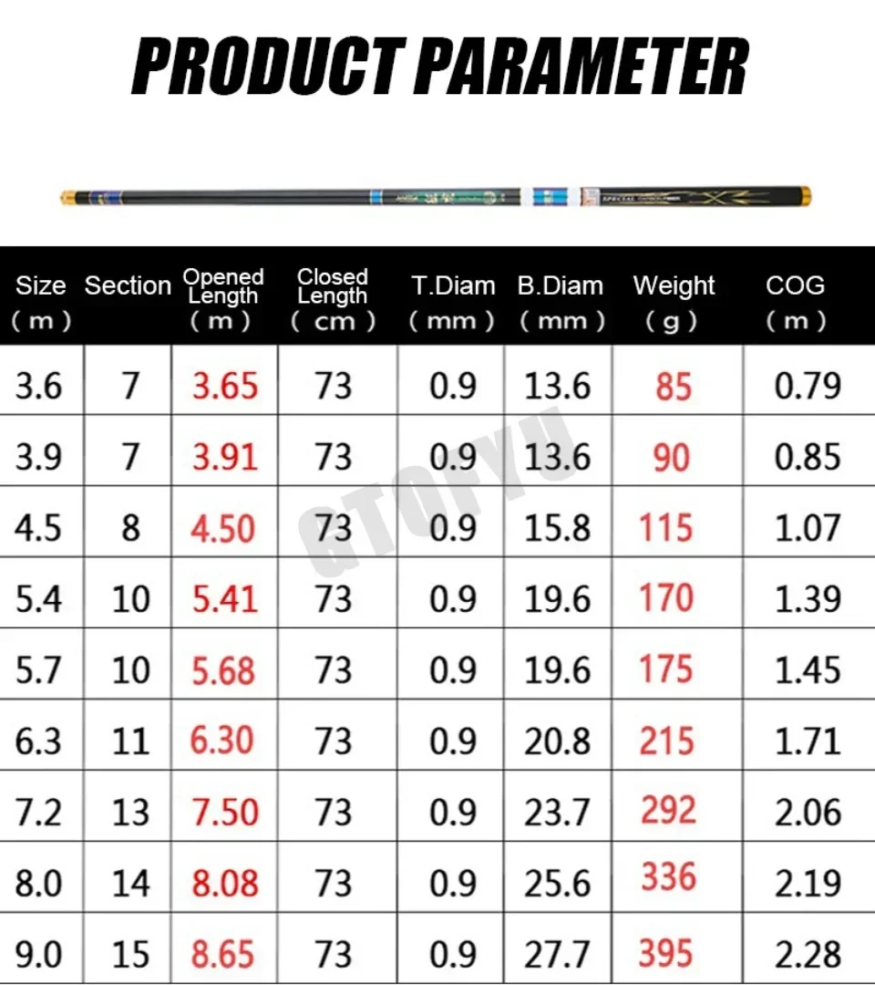 Caña de flujo telescópica 3,6 M/4.5 M/5,4 M/6,3 M/7,2 M/8 M/9 M, caña de pescar con estanque de depósito de carbono, caña de pescar manual de fibra dura súper ligeraCaracterísticas:¡100% nuevo y de alta calidad!!Materiales de caña de pescar telescópica: 36T alto contenido de carbonoColor: como muestran las imágenesTamaño: 9 longitudes para que usted elija Longitud: 3,6 M/3,9 M/4,2 M/4.5 M/5,4 M/6,3 M/7,2/8 M/9 M/10 MEl paquete incluye: 1 * caña de pescar + 1 * puntaNotas:1. Puede haber una diferencia de 1-3 cm debido a la medición manual.