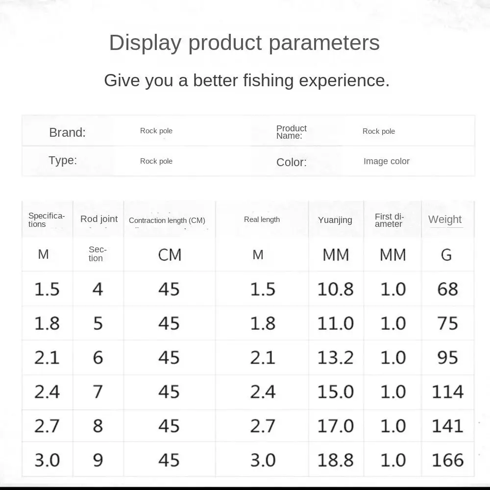 Categoría de producto: pesca montó material: FRP es escalable: sí escenarios aplicables: ríos y lagos estilo: 1,5 m, 1,8 m, 2,1 m, 2,4 m, 2,7 m, 3m Tamaño Plegable: 45cm (17,72 pulgadas) color: dorado/azul paquete incluido: 1 pieza de pesca. Aviso: 1 transición: 1cm (0,39 pulgadas)=10Mm=0,39 pulgadas. 2. Permita un error de 1-2mm (0,04-0,08 pulgadas) debido a la medición manual y asegúrese de que no le importe antes de realizar el pedido. 3. Por favor, comprenda que los colores pueden existir aberraciones cromáticas debido a la diferente colocación de las imágenes.
