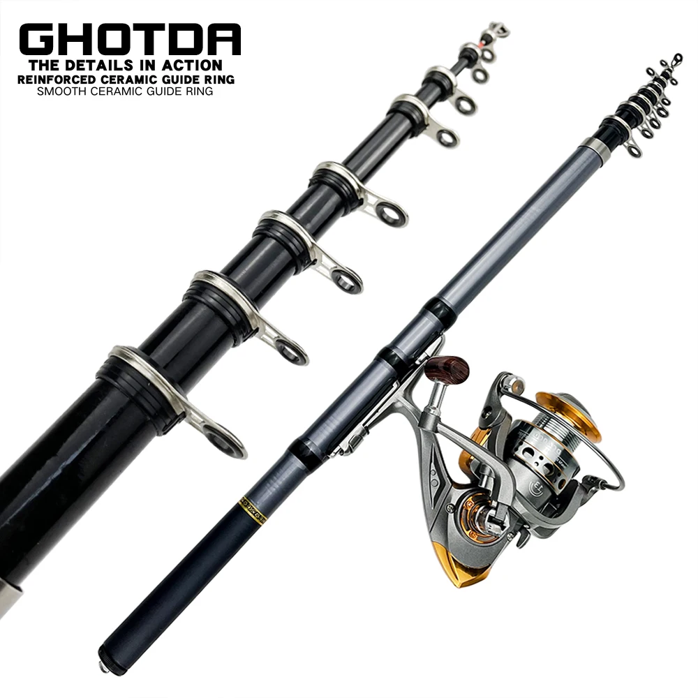 Juego de cañas de pescar de roca telescópicas portátiles de fibra de carbono de 1,8 m-3,0 m, cañas giratorias portátiles y carretes giratorios multifunción para carpa