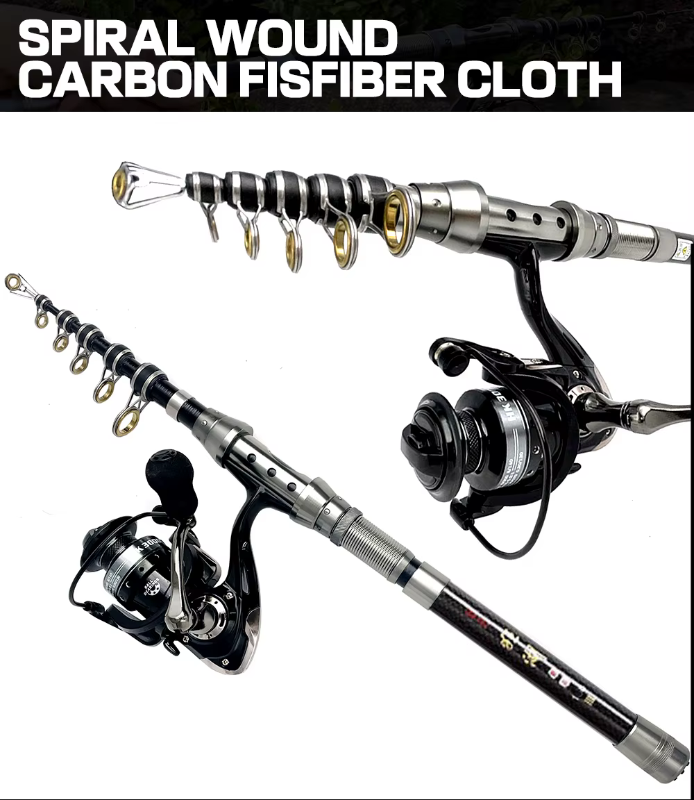 1. Esta caña de pescar está hecha de fibra de carbono, fuerte y duradera.
