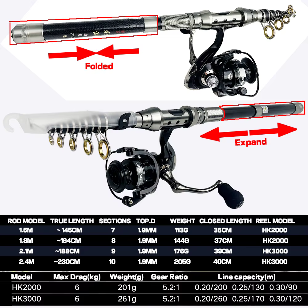 Combo de caña de pescar de mar telescópica y carrete de pesca giratorio