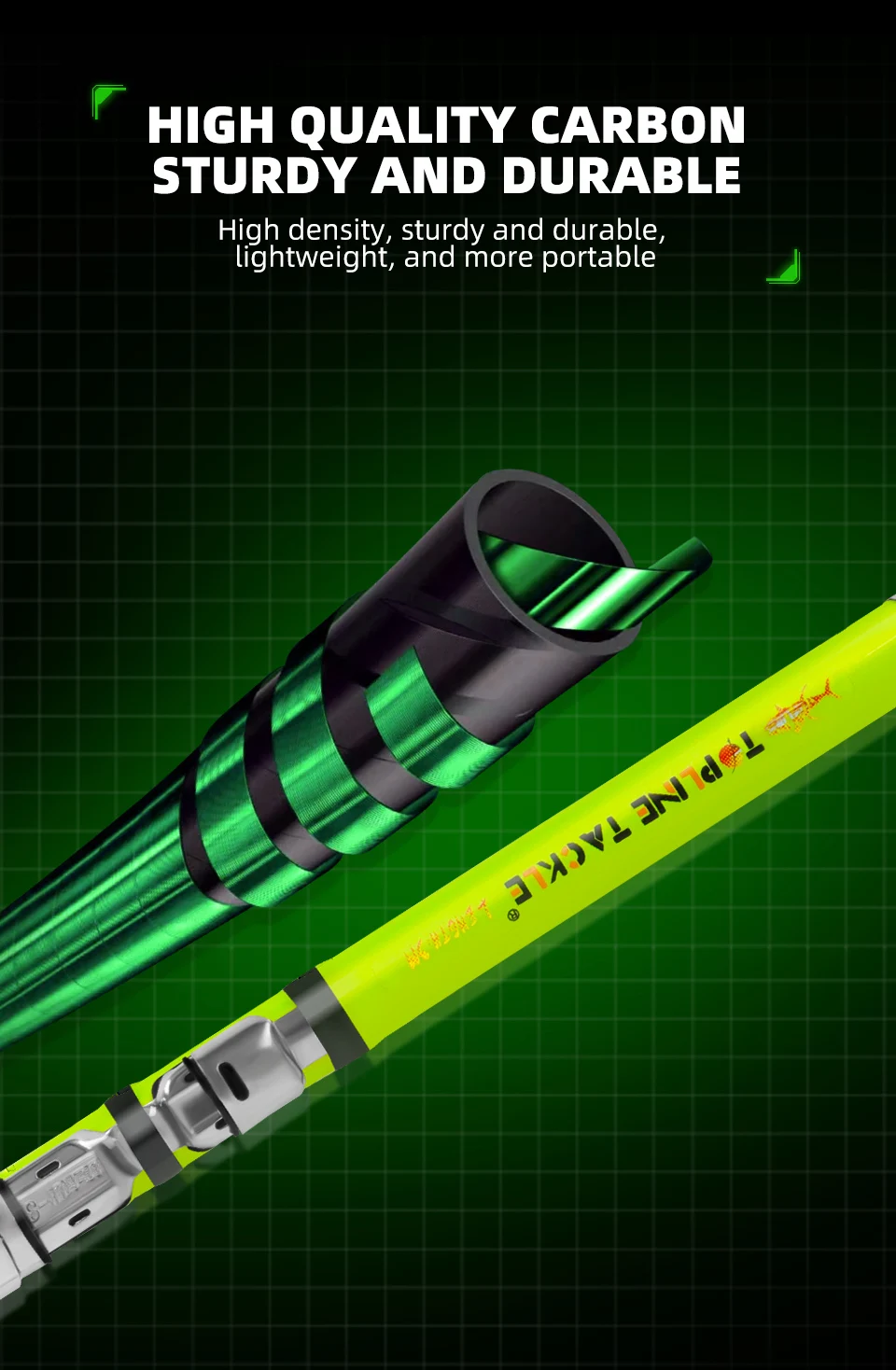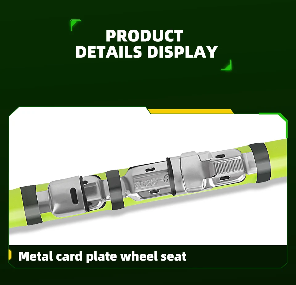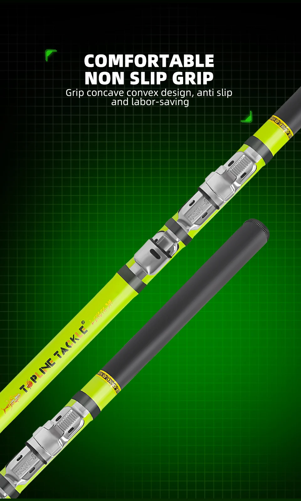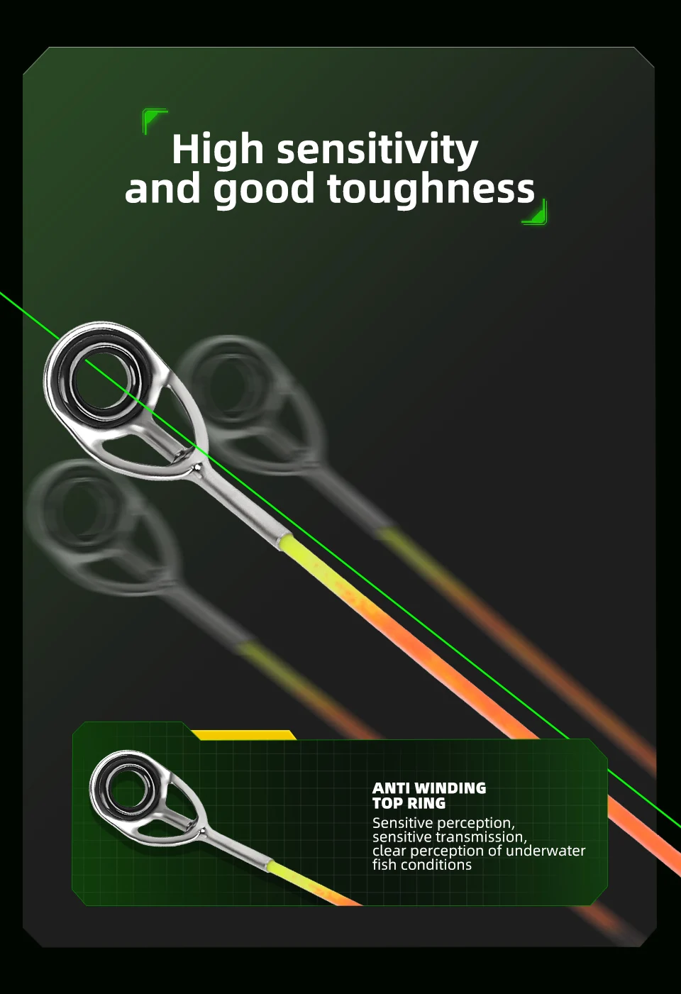 • Hecho de fibra de carbono para ultraligero y durabilidad:La caña está hecha de fibra de carbono, lo que la hace ultraligera y duradera, perfecta para largos viajes de pesca y batallas con peces grandes.