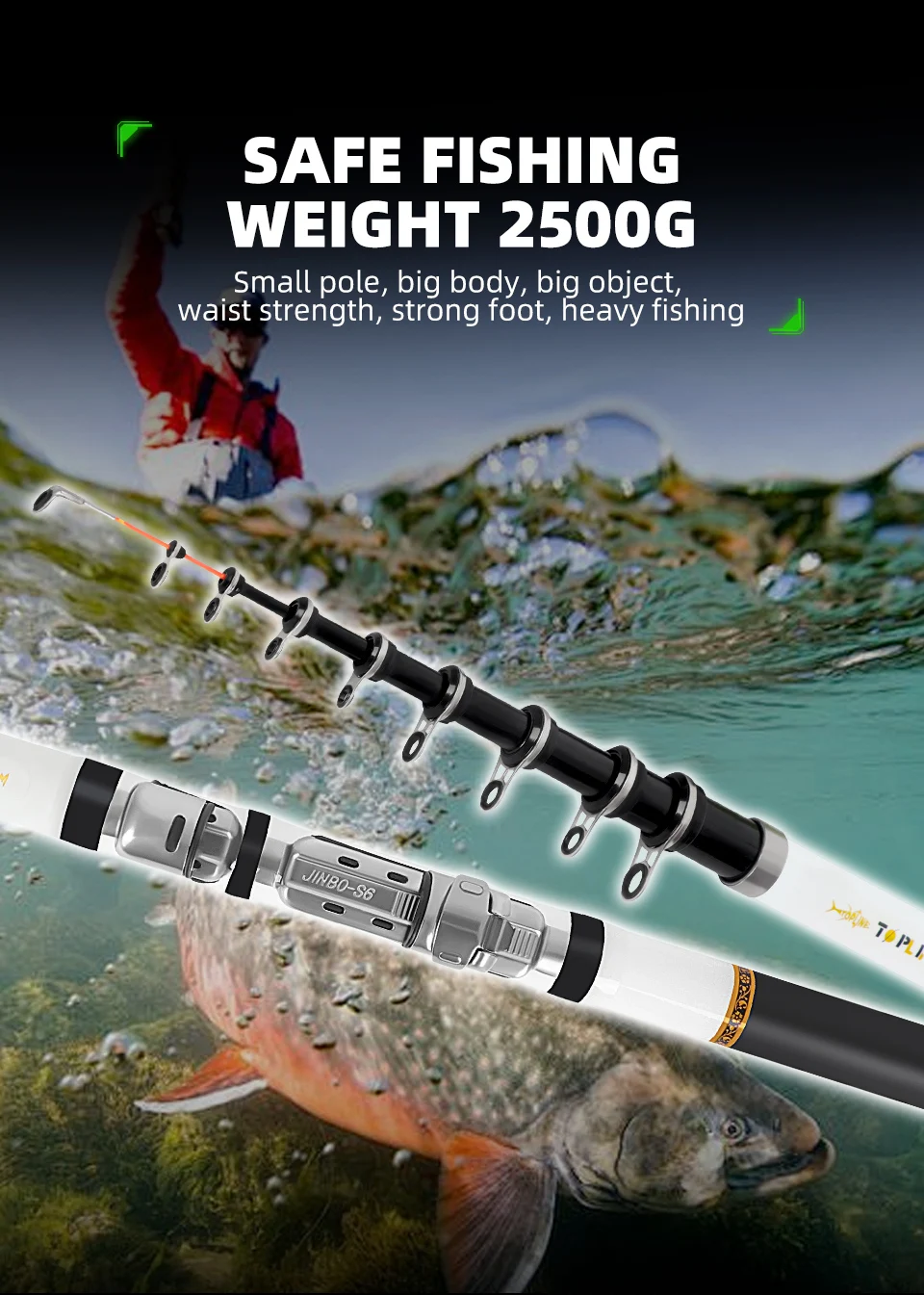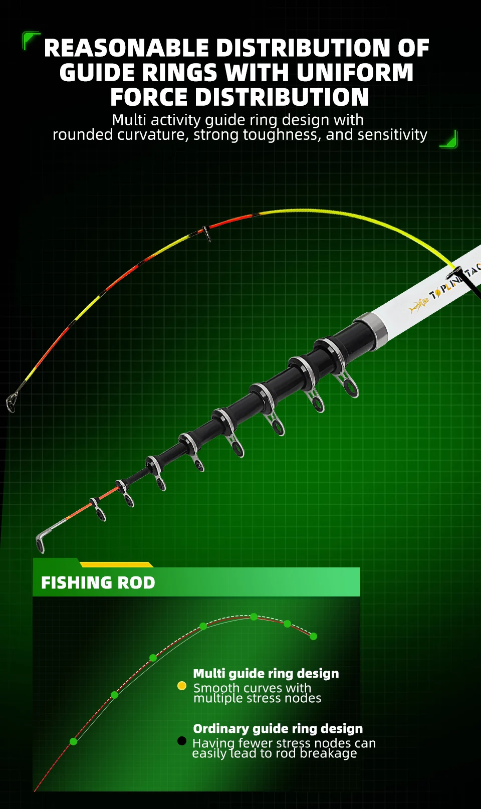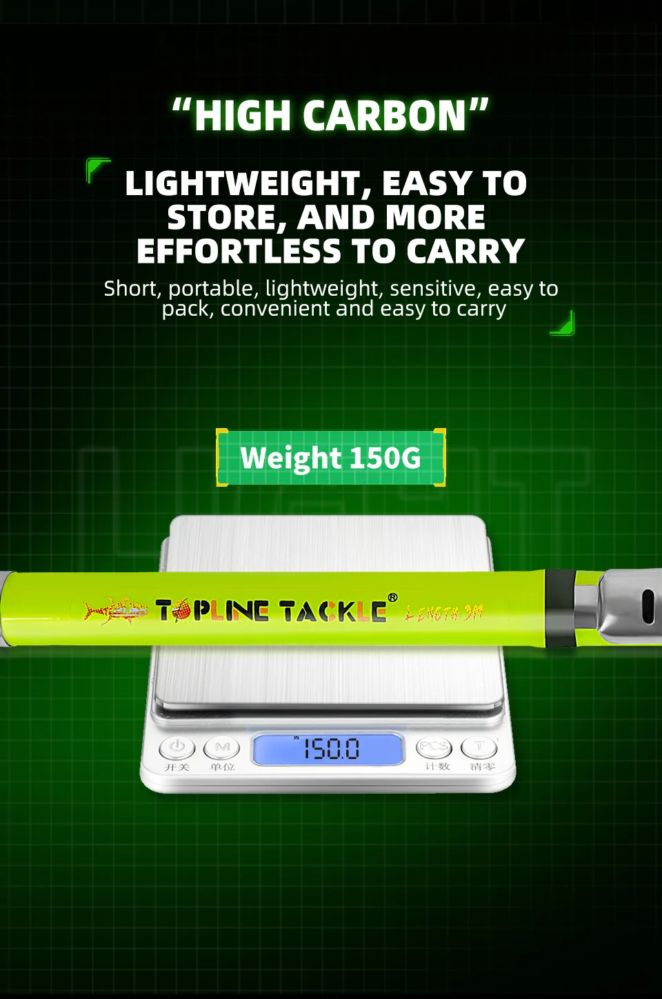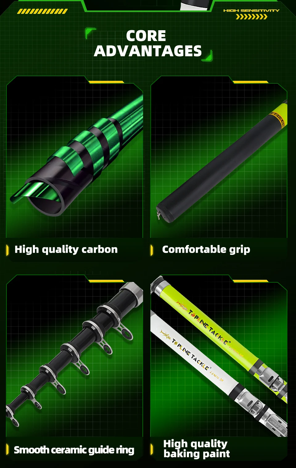 • Hecho de fibra de carbono para ultraligero y durabilidad:La caña está hecha de fibra de carbono, lo que la hace ultraligera y duradera, perfecta para largos viajes de pesca y batallas con peces grandes.