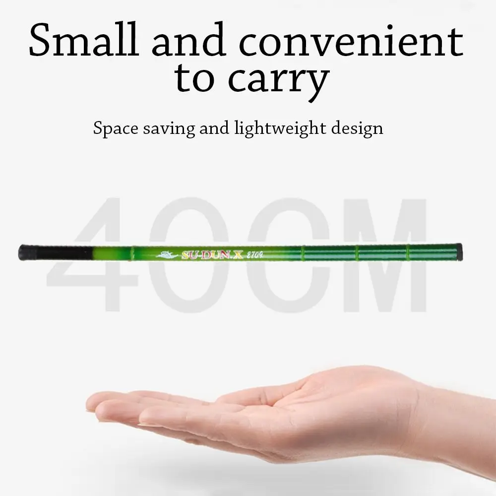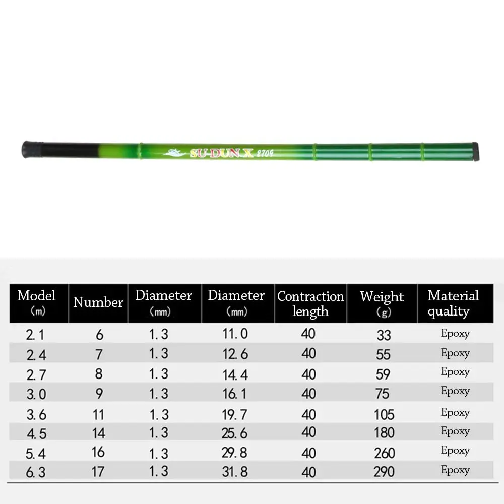 Tipo: caña de pescar telescópica Material:FRP Longitud: 1,8/2,1/2,4/2,7/3,0/3,6/4,5/5,4/6,3 m Longitud de contracción: 40 cm Color: como muestra la imagen. Adecuado para: Arroyo, río, lago, estanque de depósito. Peces objetivo: carpa, besugo, tilapia y otros peces de agua dulce. Características: 1. La longitud de contracción es de aproximadamente 40 cm,. Y es portátil para el transporte. 2. Recubrimiento avanzado general. 3. Mango tejido, suave y cómodo, cuando se sujeta durante mucho tiempo. 4. El cuerpo de la varilla es adecuado para tela de carbono de alta calidad, tejido cruzado. Curvatura mejorada para evitar roturas. El paquete incluye: 1 * caña de pescar. Nota: 1. Consulte la medición. Se permiten pequeños errores de medición dentro del rango normal. 2. Puede haber una ligera diferencia de color debido al monitor, La Cámara u otros factores, consulte el producto real.