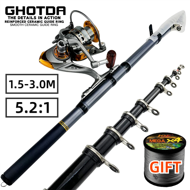 Caña de pescar en roca telescópica y carrete Combo poste de carbono ultraligero 1,5-3M con rueda de lanzamiento de cebo 5,2: 1 de alta velocidad para todas las aguasVarilla 1,5 M + carrete 10001,8 M Varilla + 1000 Carrete2,1 M Varilla + 2000 CarreteVarilla 2,4 M + carrete 20002,7 M Varilla + 3000 CarreteVarilla 3,0 M + carrete 3000