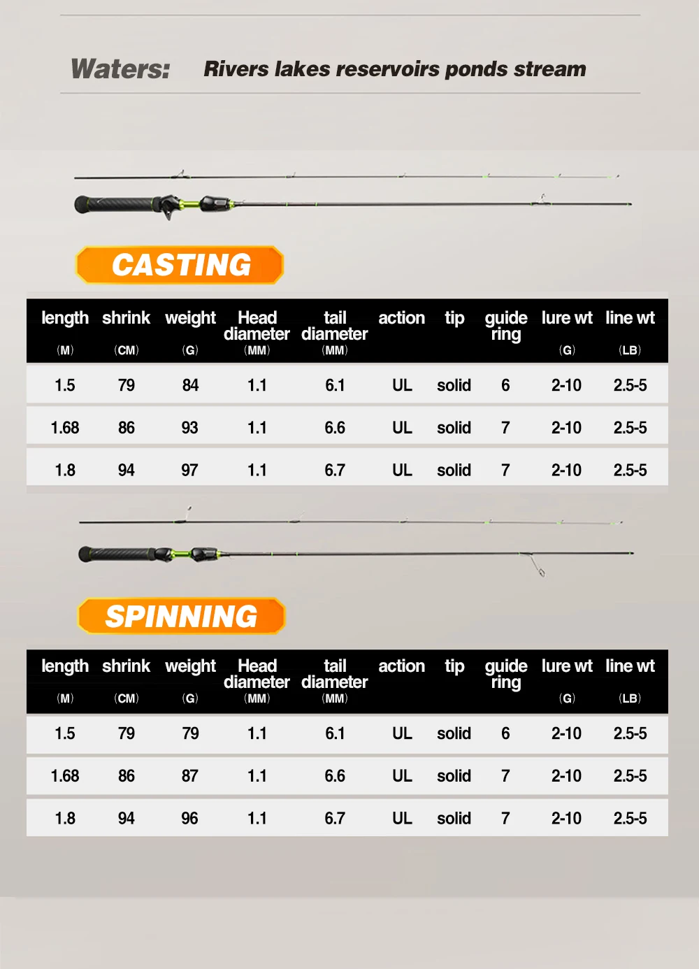 La longitud de la varilla es de aproximadamente 1,5/1,68/1,8 m;
