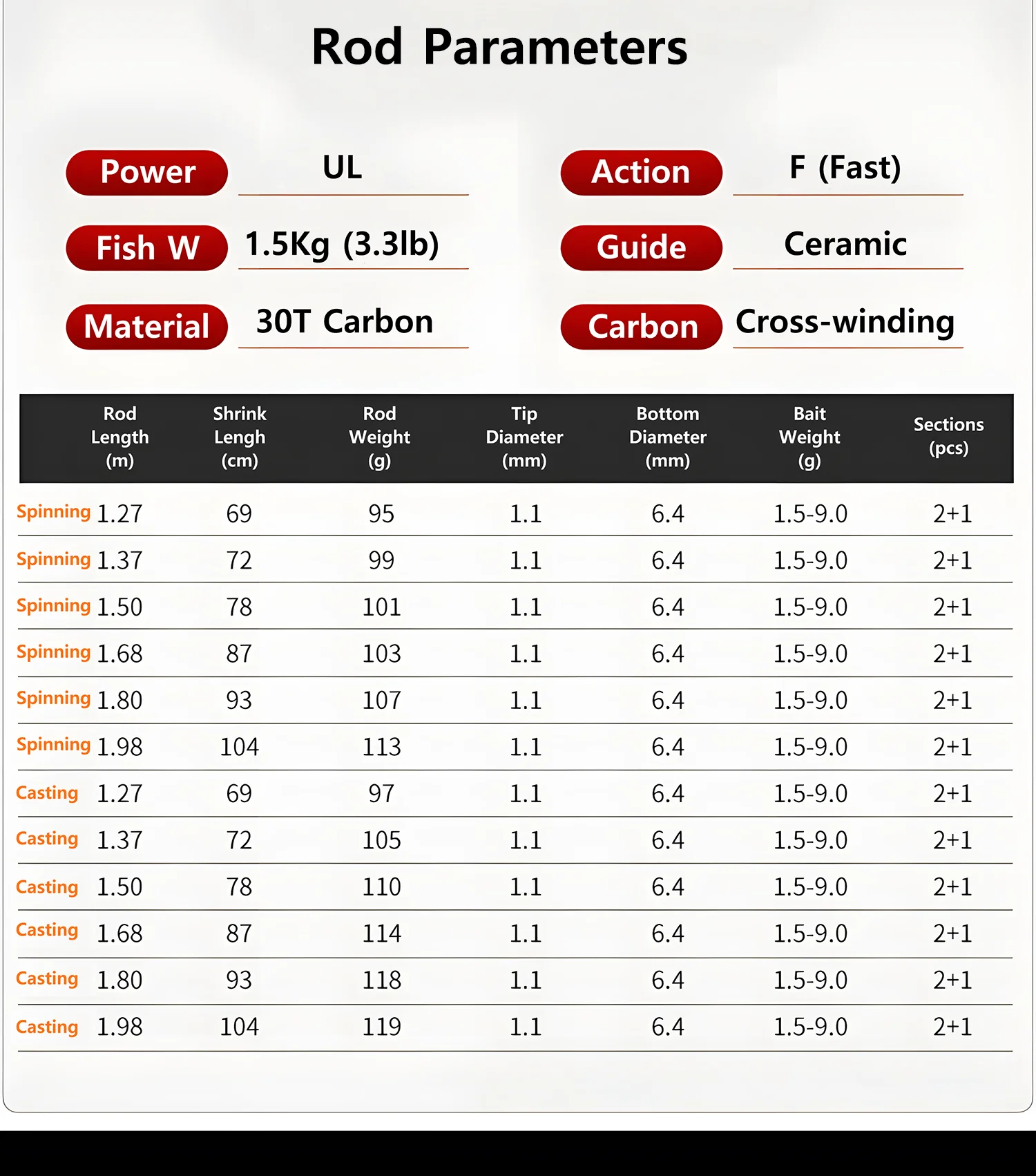 * Longitud de la caña de pescar: 1,27 m / 1,37 m / 1,5 m / 1,68 m / 1,8 m