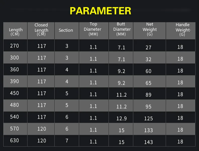Longitud: 2,7-6,3 m Longitud cerrada: 117/120cm