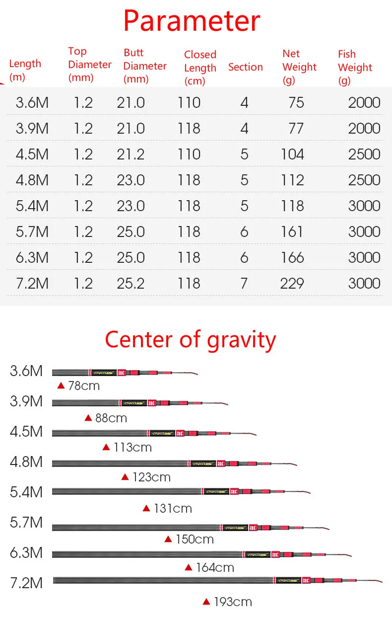 Longitud: 3,6-7,2 m Longitud cerrada: 1110/118cm