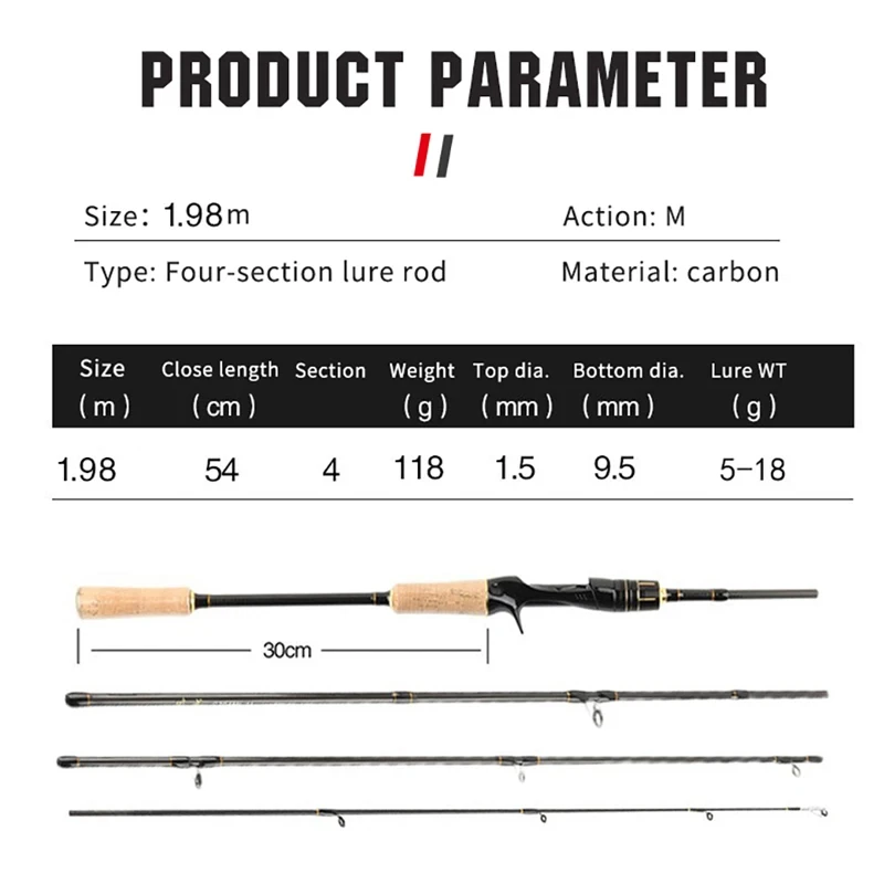 Caña de pescar ultraligera de fibra de carbono de 1,98 metros con mango de pistola de cuatro secciones, caña de pescar enchufable, caña de pescar con agarre de corcho natural de fibra de carbono