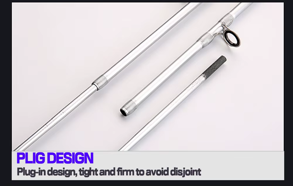 Longitud del modelo: 1,65 M/1,80 MLongitud cerrada: 87cm/ 94cmMango: fundición (con gancho)/hilado (sin gancho)CaracterísticasPuntas sólidas de 2,25mmEl peso del señuelo es de 3G-20G, aplicabilidad más amplia.Cerámica de alta resistenciaLa guía está equipada con cerámica de alta resistencia, que es más suave y duradera que las guías normales.Varilla de carbono de dos seccionesCuerpo de fibra de carbonoFibra de carbono de alta densidad, el proceso de bobinado cruzado de tela de fibra de carbono de alta densidad hace que la caña sea más fuerte y más antitorsión, y no es fácil de romper al pescar peces grandes.Mango EVAHecho de material EVA de alta densidad, se siente mejor y se puede usar durante todo el año en agua dulce.El paquete incluye1 x caña de pescar(No incluye el carrete de pesca y el soporte de la caña)