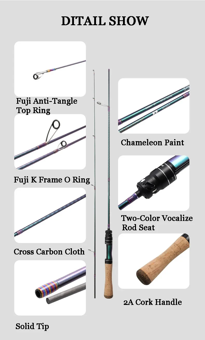 Longitud: 1,53 m| Longitud cerrada: 79 cm| Sección: 2| Acción: Rápida| Potencia: UL| Peso: 75 g| Diámetro superior: 1,1 mm| Diámetro inferior: 6,29 mm| Peso de la línea: 2-6 libras|Peso del señuelo: 1-8 g