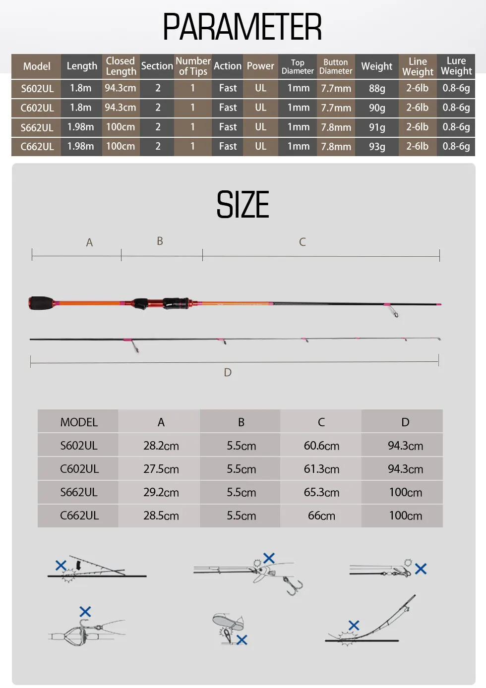 Longitud: 1,8 m|Longitud cerrada: 95 cm|Peso: 90 g|Peso del señuelo: 0,8-6 g|Peso de la línea: 2-6 libras|Acción): Rápida|Potencia: UL|Diámetro inferior: 7,7 mm|Diámetro superior: 0,74 mm|Sección: 2|