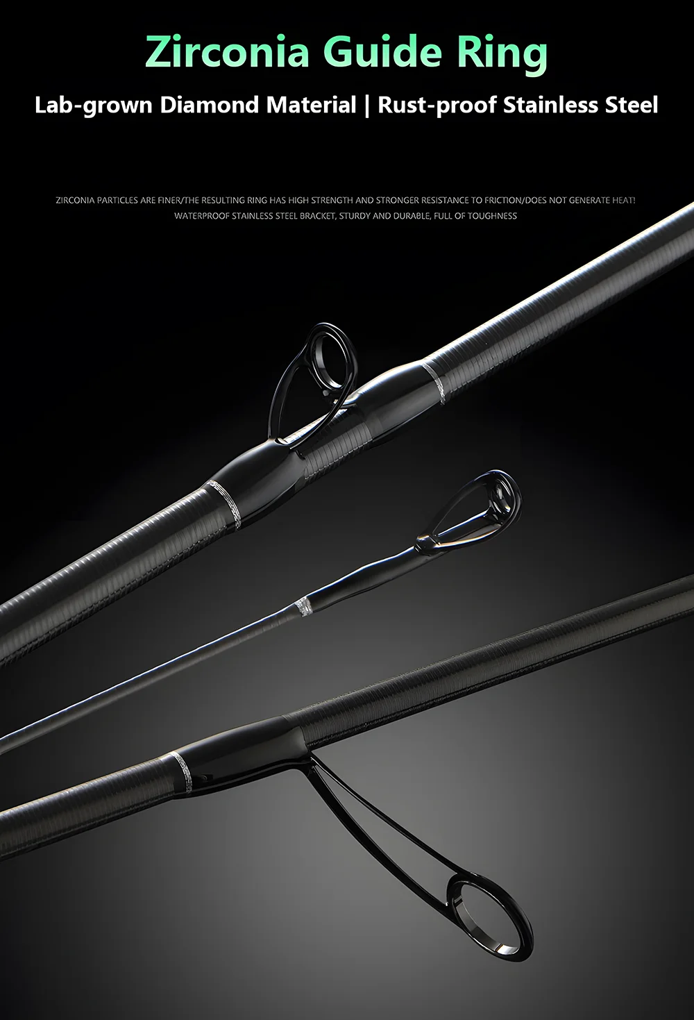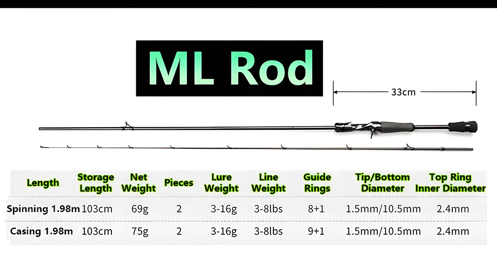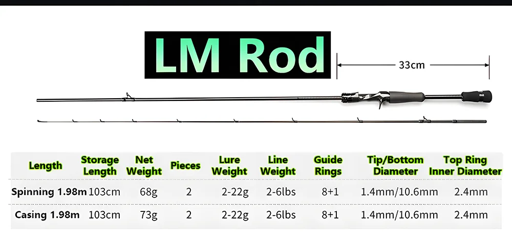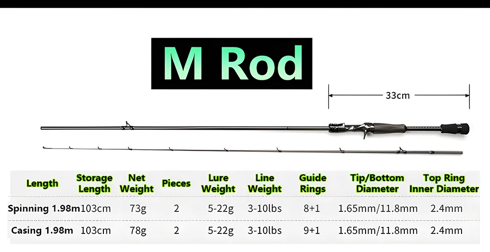 * Fundición 1,98 m - Longitud de almacenamiento 103 cm / Peso neto 78 g / Peso del señuelo 5-22 g / Peso de la línea 3-10 lbs / Anillos guía 9 + 1 / Diámetro superior 1,65 mm / Diámetro inferior 11,8 mm / Diámetro interior del anillo superior 2,4 mm