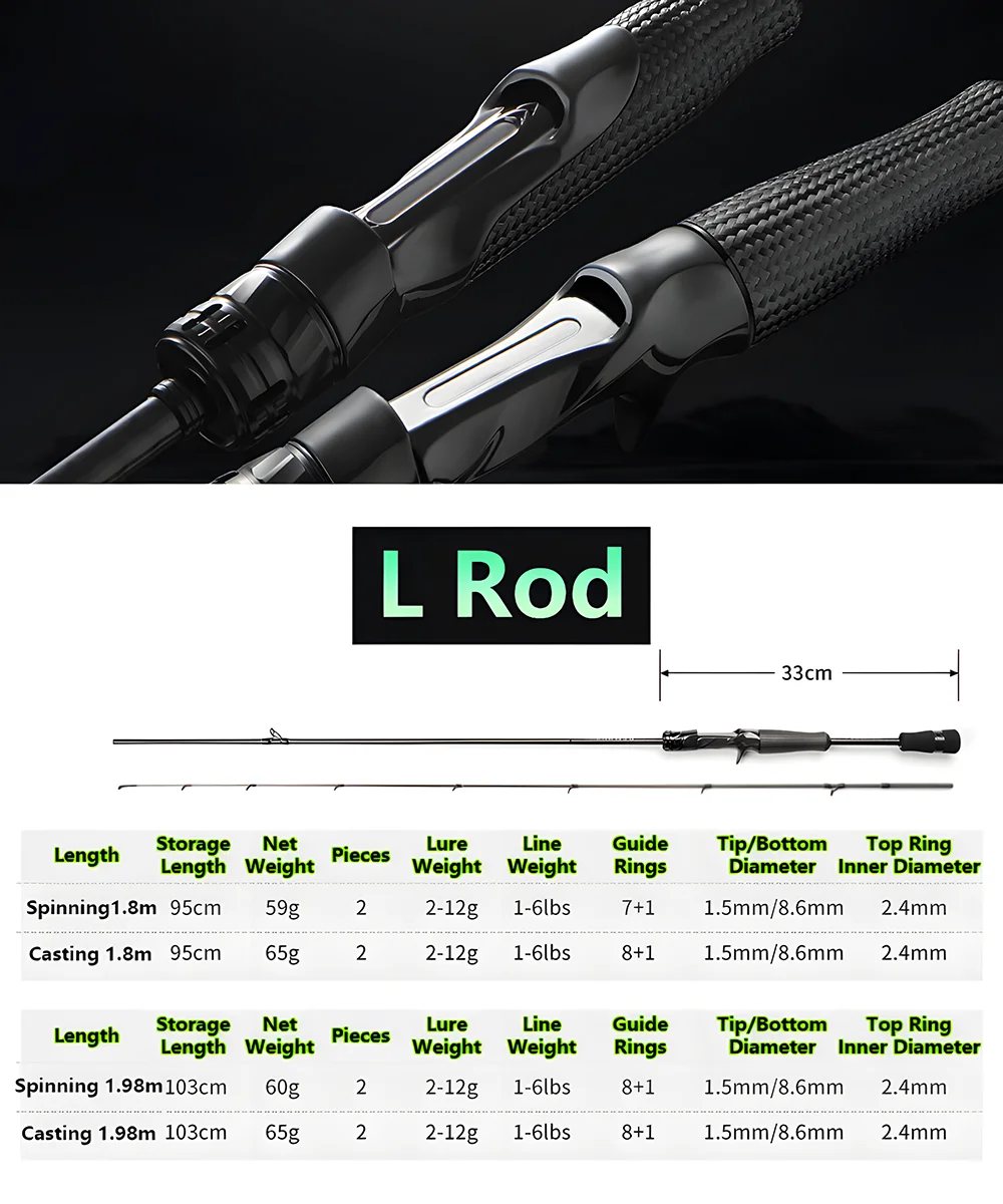 * Fundición 1,98 m - Longitud de almacenamiento 103 cm / Peso neto 65 g / Peso del señuelo 2-12 g / Peso de la línea 1-6 lbs / Anillos guía 7 + 1 / Diámetro superior 1,5 mm / Diámetro inferior 8,6 mm / Diámetro interior del anillo superior 2,4 mm
