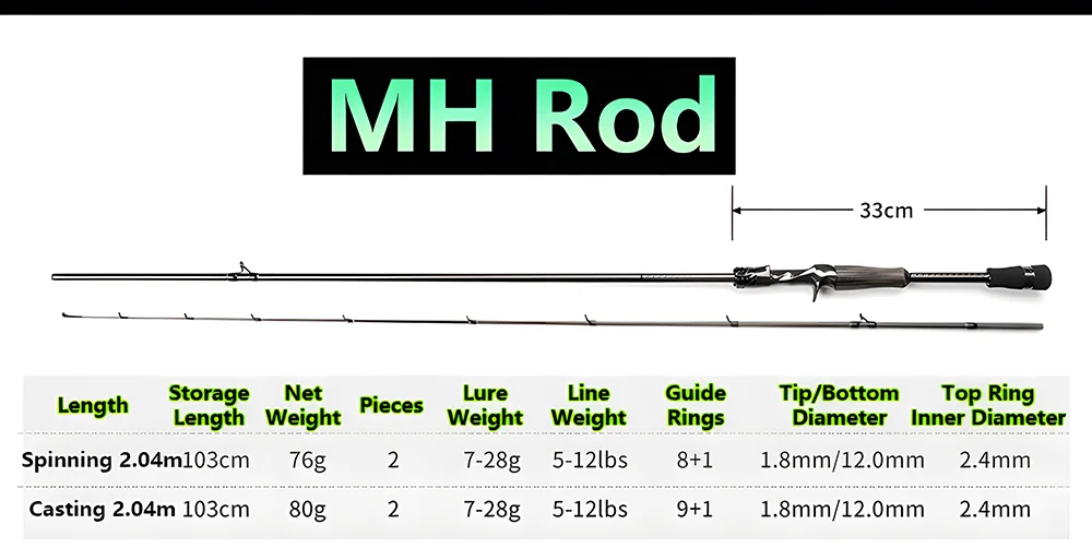 * Fundición 2,04 m - Longitud de almacenamiento 103 cm / Peso neto 80 g / Peso del señuelo 7-28 g / Peso de la línea 5-12 lbs / Anillos guía 9 + 1 / Diámetro superior 1,8 mm / Diámetro inferior 12 mm / Diámetro interior del anillo superior 2,4 mm