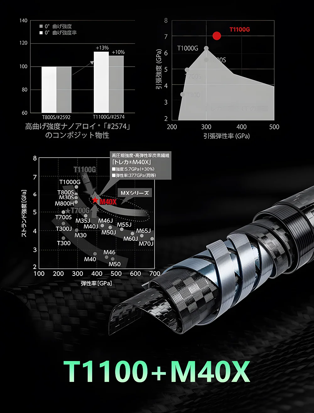 * T" significa resistencia a la tracción.El T1100 tiene una resistencia a la tracción de 7000 MPa (10 veces mayor que la del acero) y un módulo elástico de 324 GPa, lo que lo convierte en una fibra de carbono de módulo medio y alta resistencia de tercera generación).