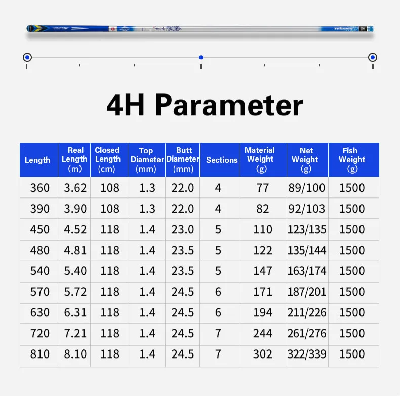 Longitud: 3,6-8,1 m Longitud cerrada: 108-118 cm