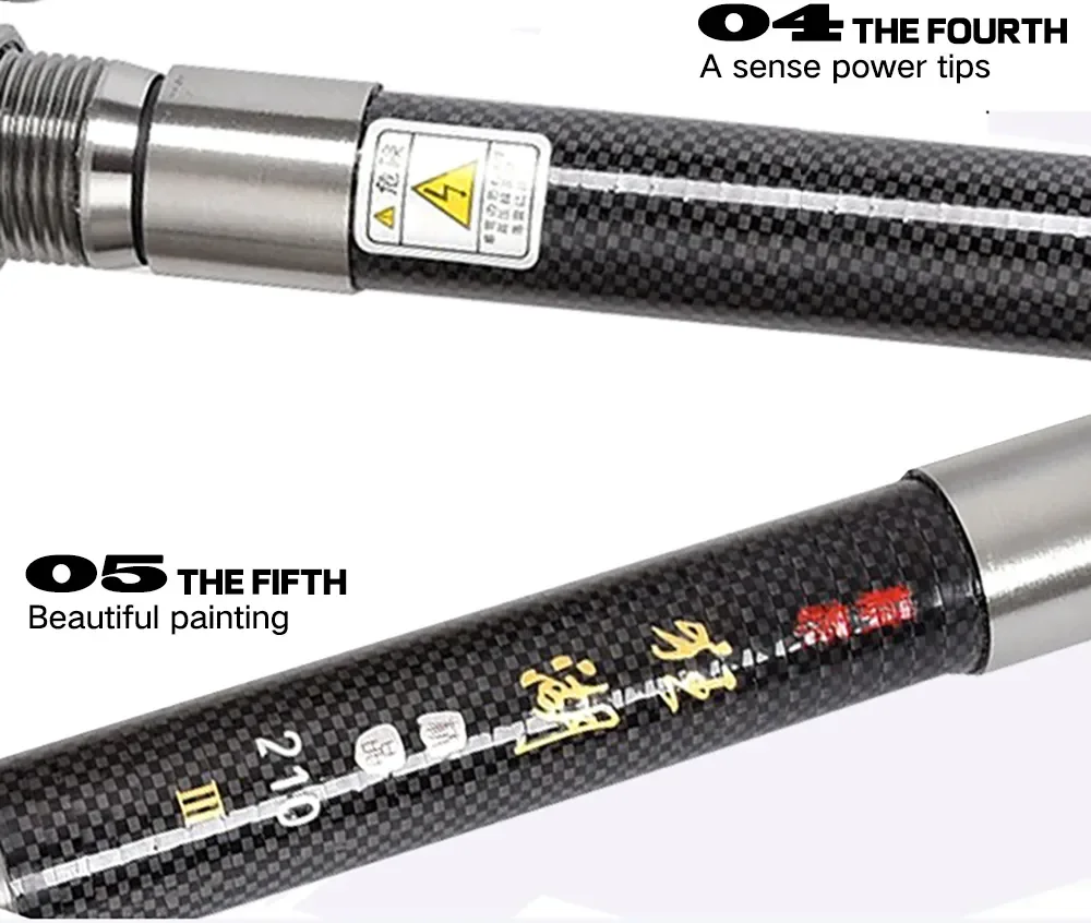 1. Esta caña de pescar está hecha de fibra de carbono, fuerte y duradera.