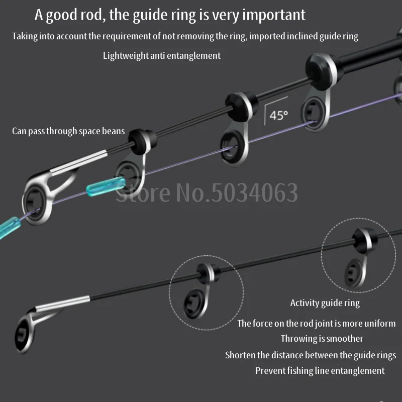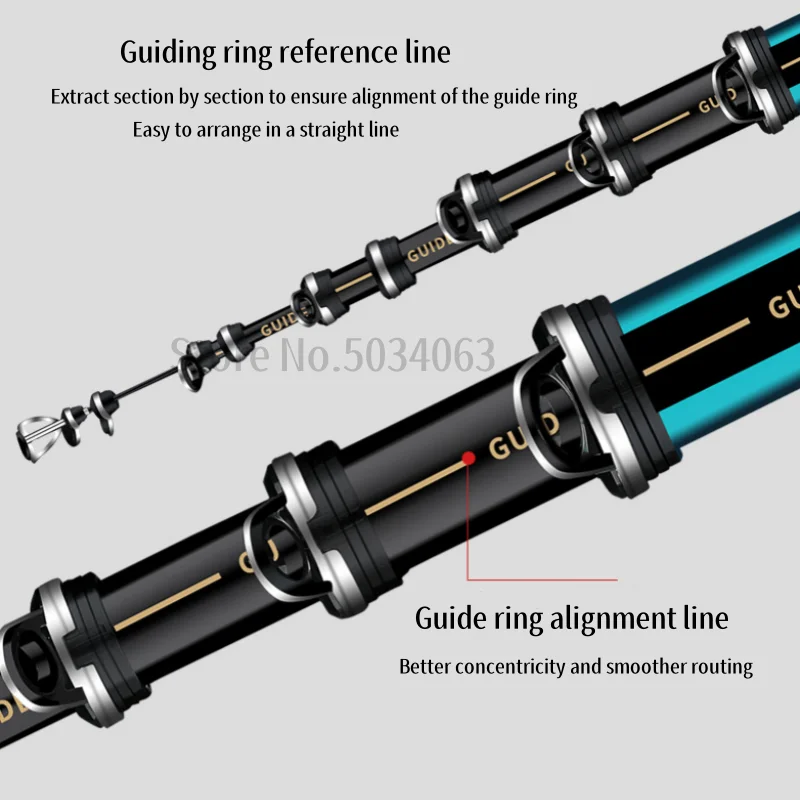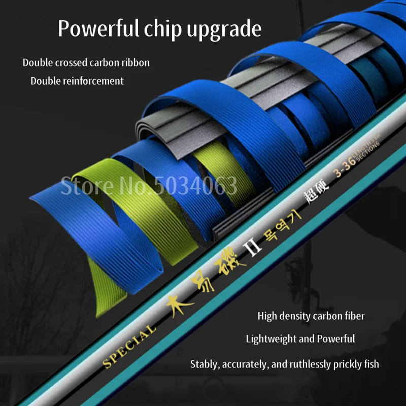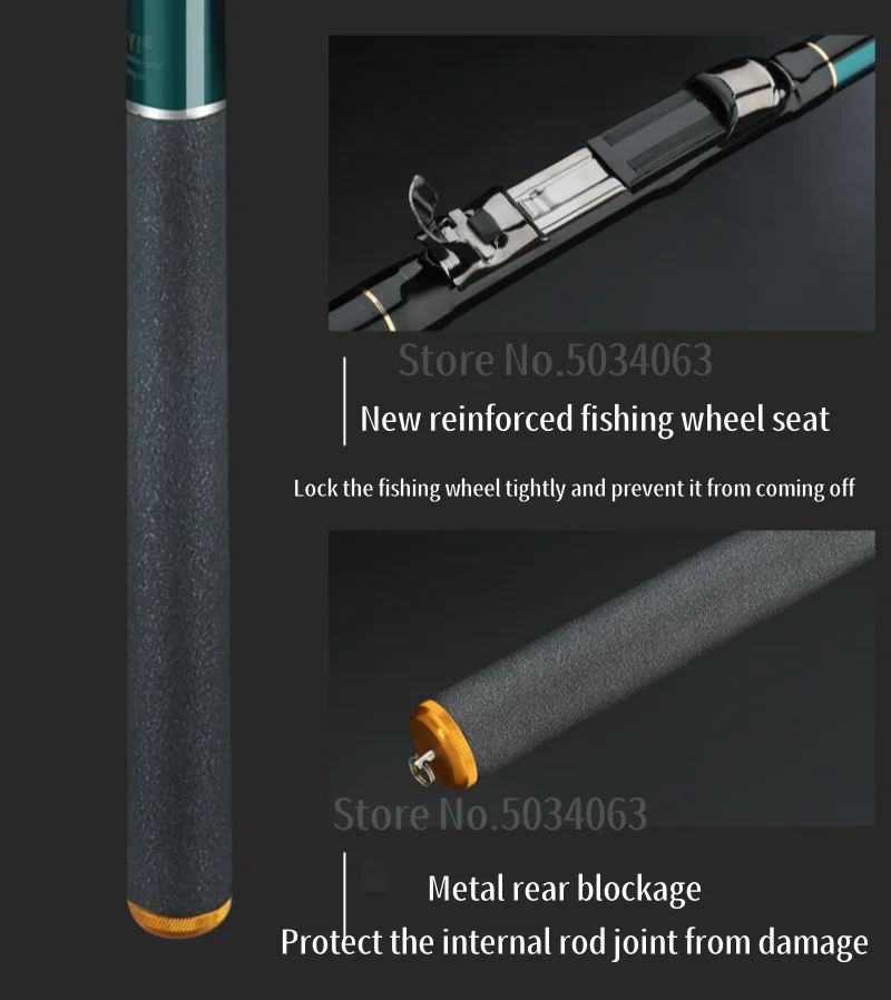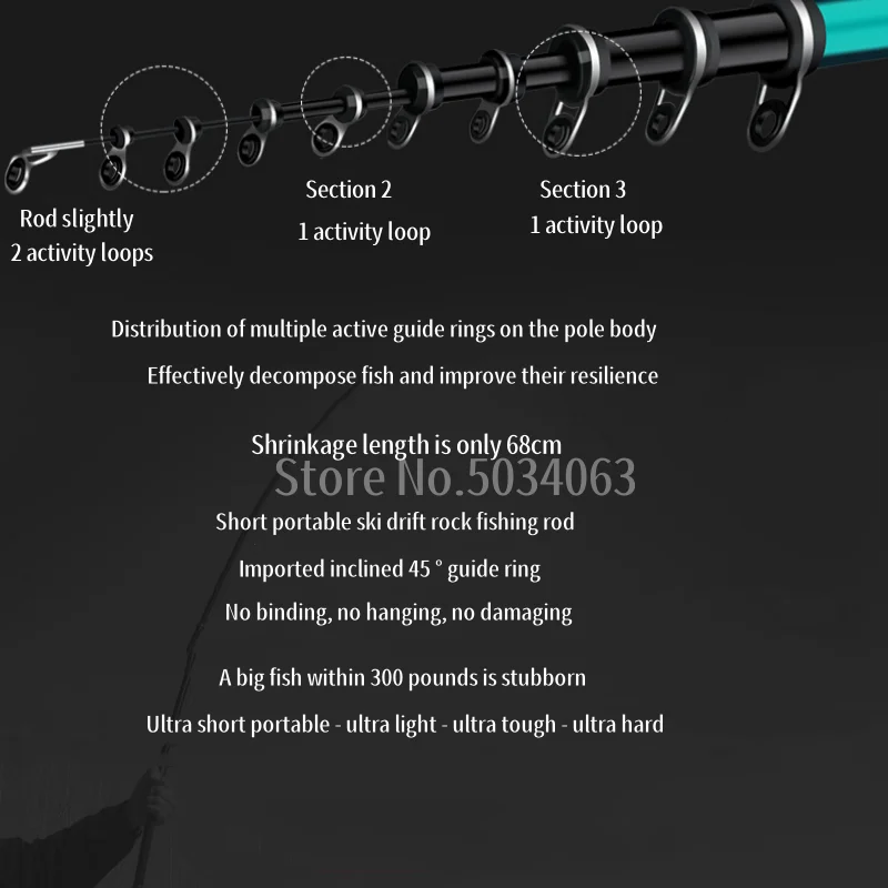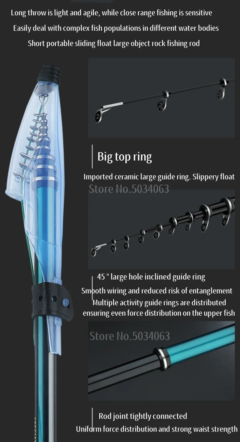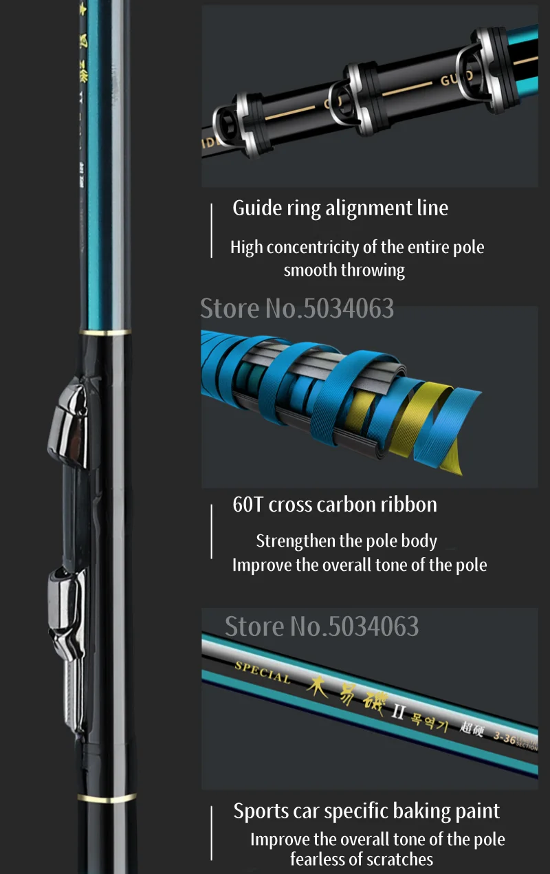 1: Esta caña de pescar está hecha de fibra de carbono cruzada de 60T, que es resistente y duradera.