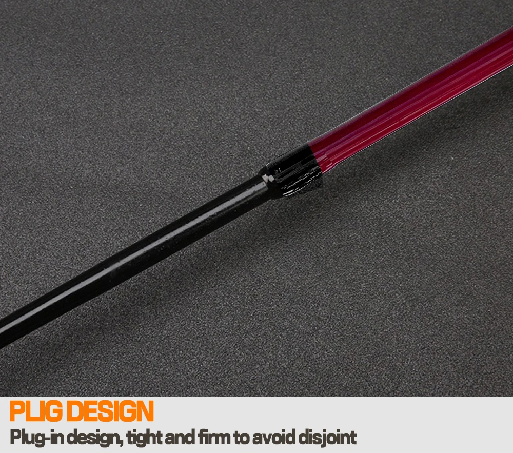 La varilla tiene un diseño de 2 secciones. El cuerpo de la varilla está construido con una cinta de malla reforzada enrollada, lo que lo hace ligero y duradero. La punta de la caña es gruesa y sensible, lo que le permite atrapar peces rápida y fácilmente sin el riesgo de romper la caña.