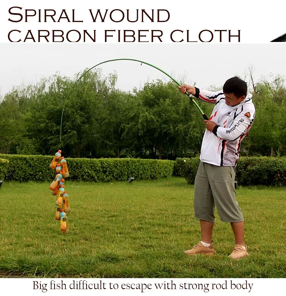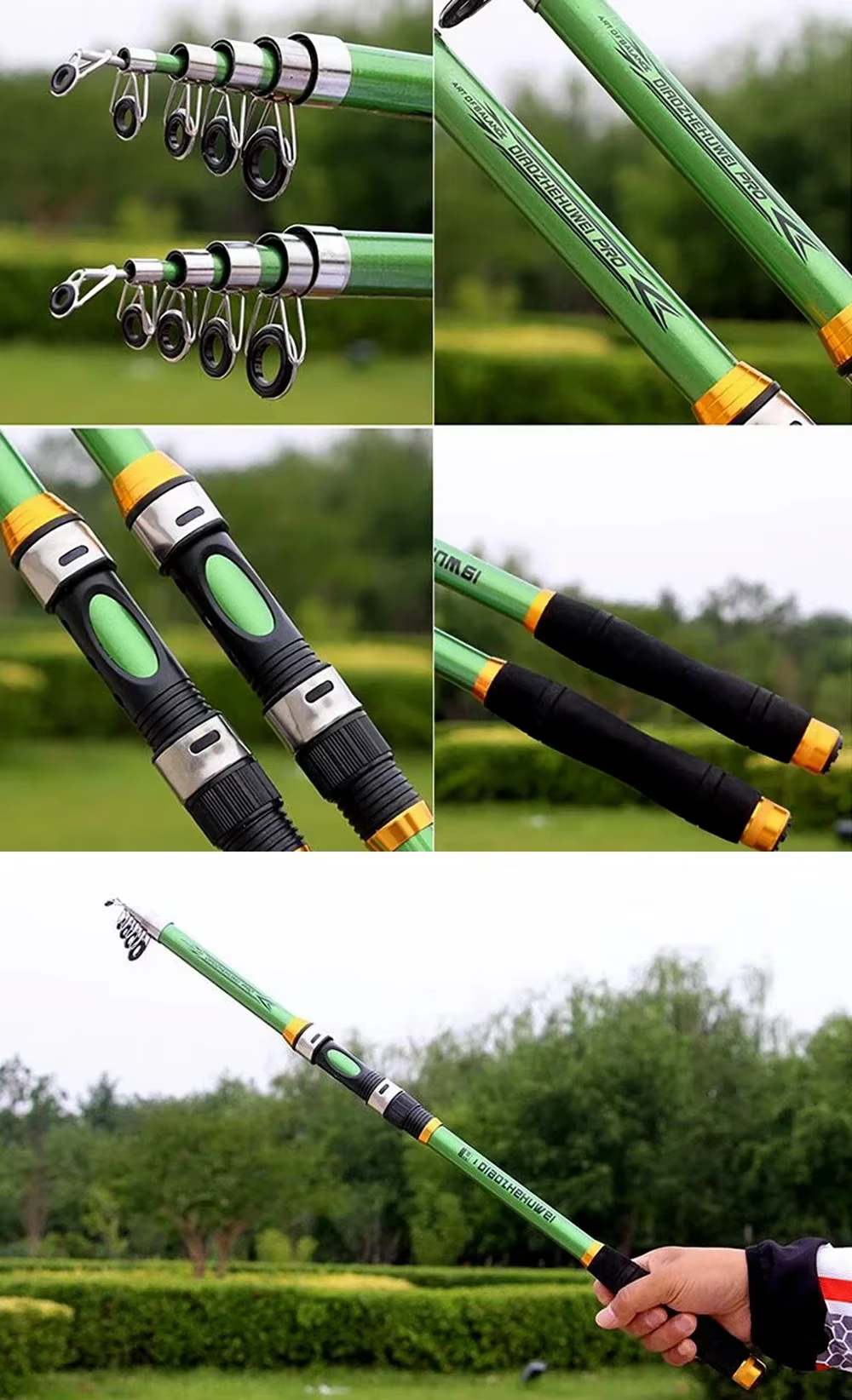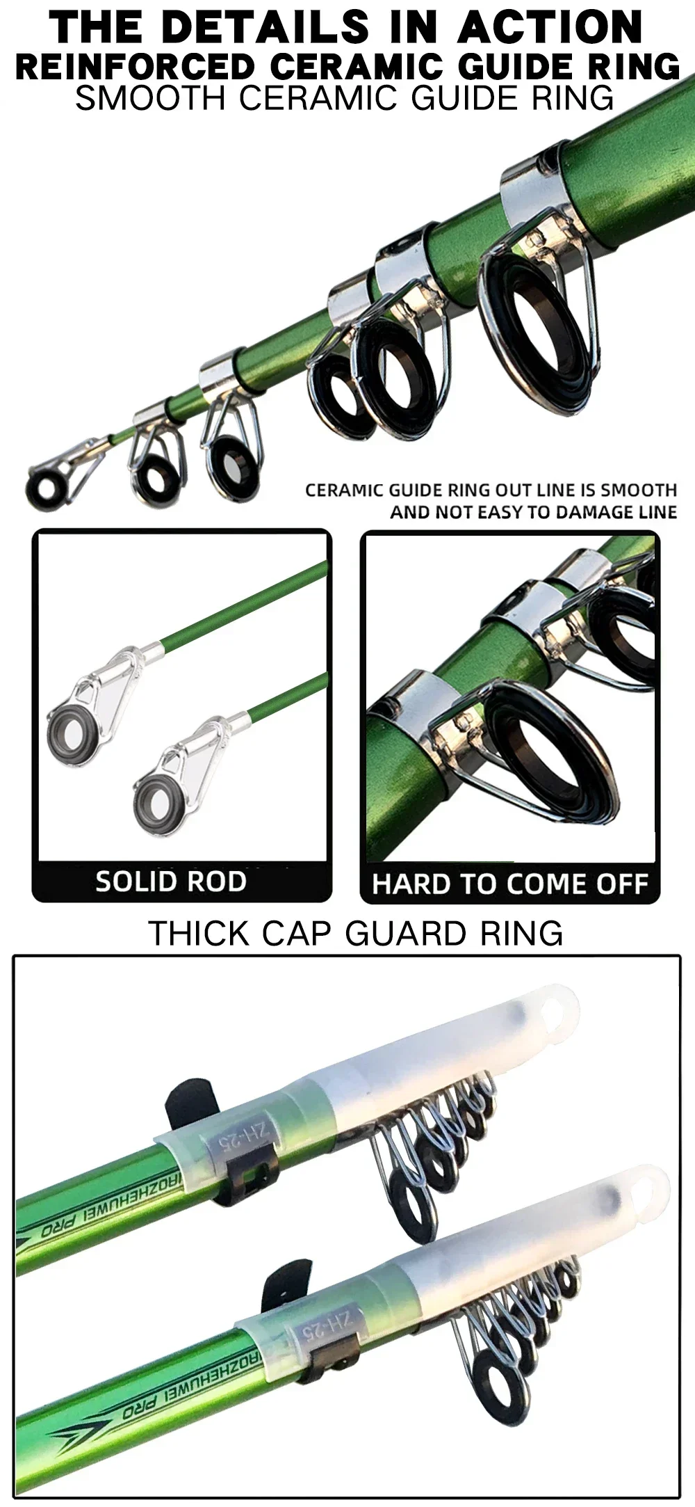 La longitud real de 2,1 M es 1,95 MLa longitud real de 2,4 M es de 2,25 MLa longitud real de 2,7 M es de 2,55 MLa longitud real de 3,0 M es de 2,90 MLa longitud real de 3,6 M es de 3,20 MCARACTERÍSTICAS1.Diseño de anillos grandes.Fabricado en cerámica y envuelto en acero inoxidable, soldadura de una sola pieza, resistente y suave.2.Asiento de carrete duradero.Es firme y fácil de arreglar el carrete, no es fácil que se caiga.3.Exquisito trabajo de pintura.4.Cómodo mango de espuma.El diseño radial y absorbente del sudor mejora en gran medida la comodidad al luchar contra un pez y no se cansa durante mucho tiempo pescando.Paquete incluido