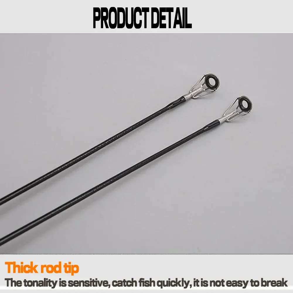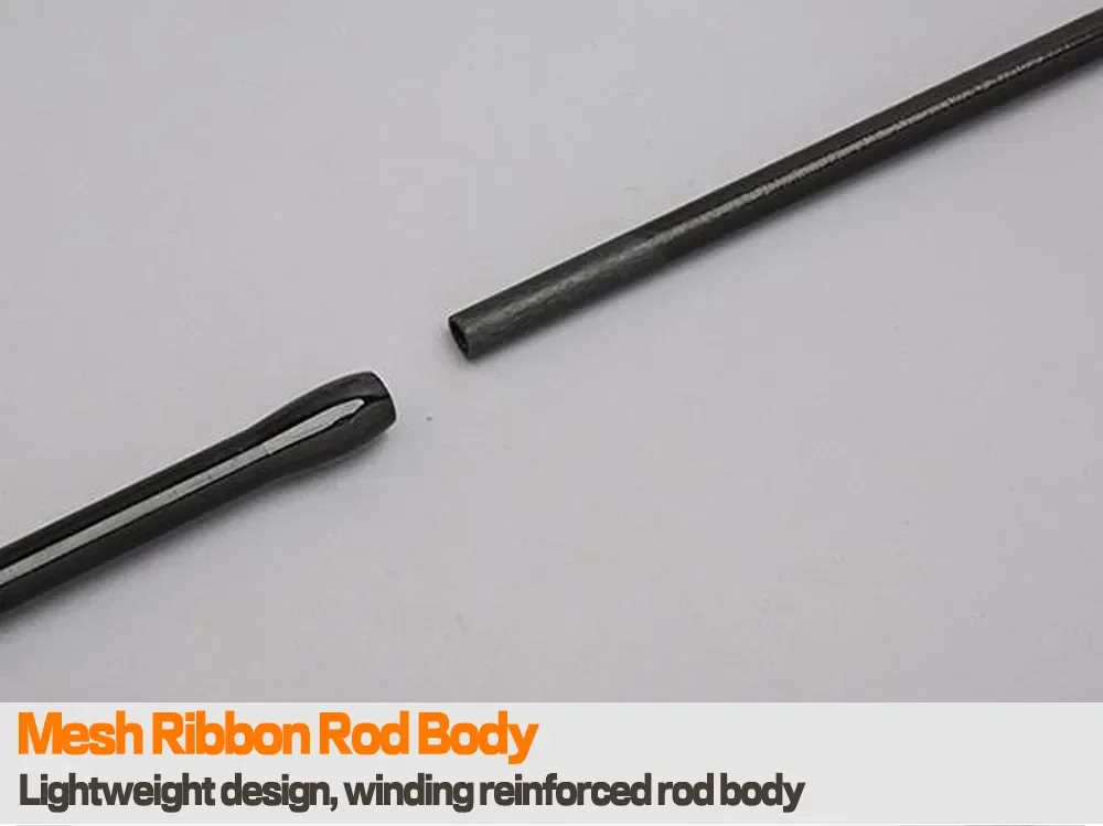 La varilla tiene un diseño de 2 secciones. El cuerpo de la varilla está construido con una cinta de malla reforzada enrollada, lo que lo hace ligero y duradero. La punta de la caña es gruesa y sensible, lo que le permite atrapar peces rápida y fácilmente sin el riesgo de romper la caña.