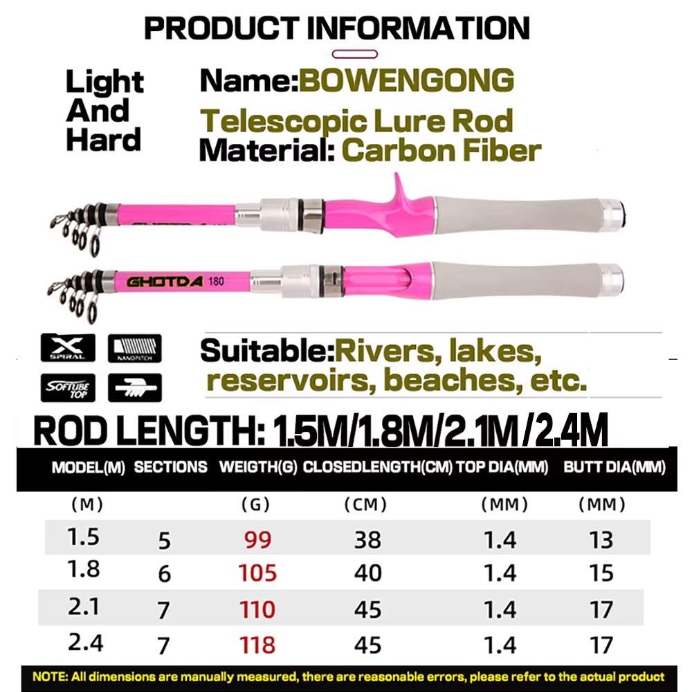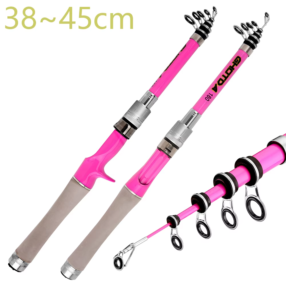 Cañas de pescar con señuelo telescópico, caña de pescar giratoria/fundida, aparejo de carbono ultraligero rosa, 1,5 m, 1,8 m, 2,1 m, 2,4 m, Jigging de trucha