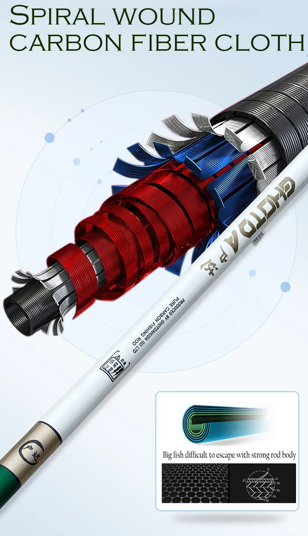 Elaboradas con fibra de carbono cruzada de alta calidad, nuestras cañas de pescar están diseñadas para ser ligeras pero increíblemente fuertes. La rotación apretada de 360 grados de la punta de la varilla garantiza que tenga un control completo sobre la dirección de su yeso, y el diseño reforzado significa que puede manejar incluso los tirones más duros.