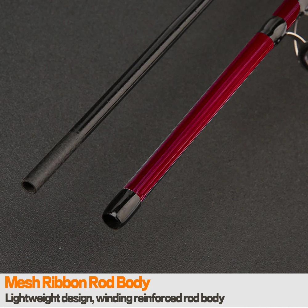 La varilla tiene un diseño de 2 secciones. El cuerpo de la varilla está construido con una cinta de malla reforzada enrollada, lo que lo hace ligero y duradero. La punta de la caña es gruesa y sensible, lo que le permite atrapar peces rápida y fácilmente sin el riesgo de romper la caña.