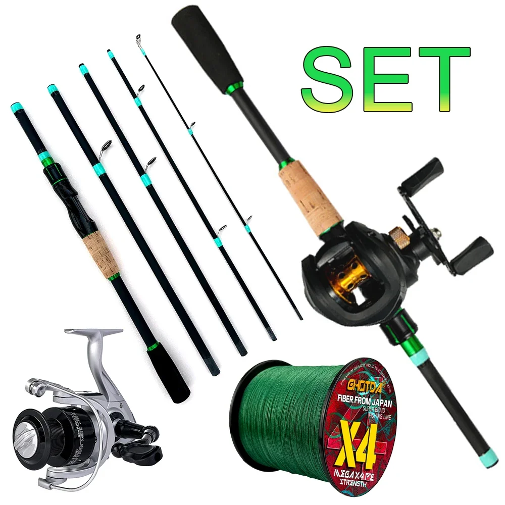 Kit de caña de pescar Baitcasting de 1,8/2,1m, carrete de caña de fundición de carbono de 4/5 secciones con juego de pesca de línea para señuelo de lubina de agua salada, peso 3,5-14g