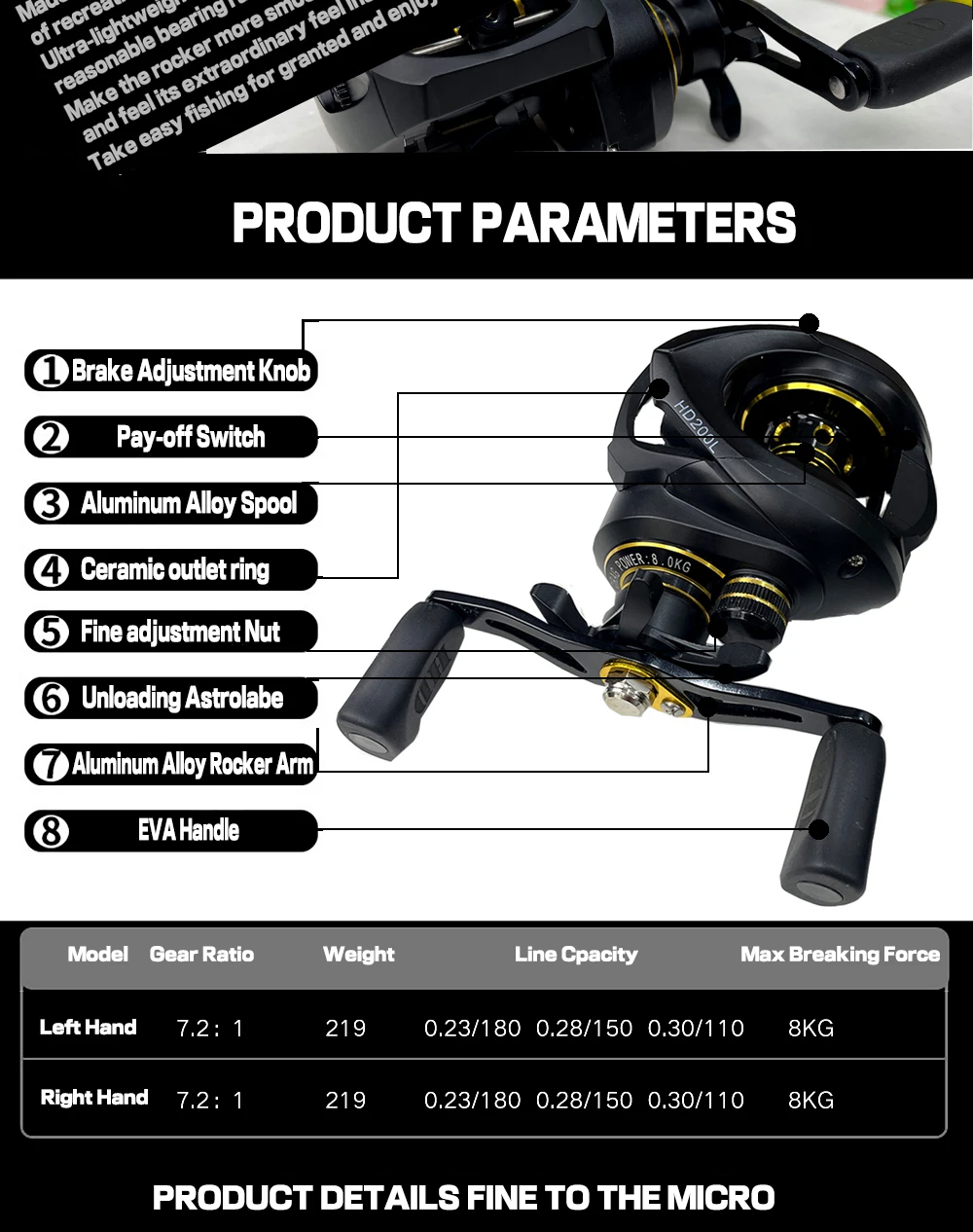 Nuestro carrete de pesca cuenta con un Mango ergonómico de EVA que proporciona un agarre cómodo y antideslizante para mejorar su experiencia de pesca. El diseño ligero de nuestro carrete de pesca le permite lanzar y recuperar sin esfuerzo durante horas sin sentirse fatigado.