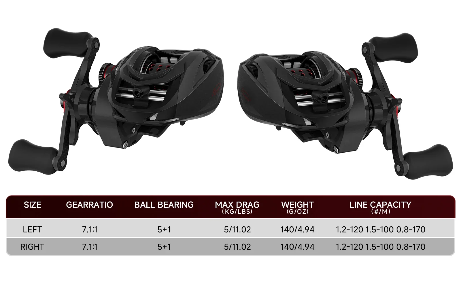 Carrete de Baitcasting de fibra de carbono MERAK, relación de engranaje de alta velocidad 7.1:1, BB de acero inoxidable 5 + 1, arrastre máximo de 11,02 lb, carrete de metal